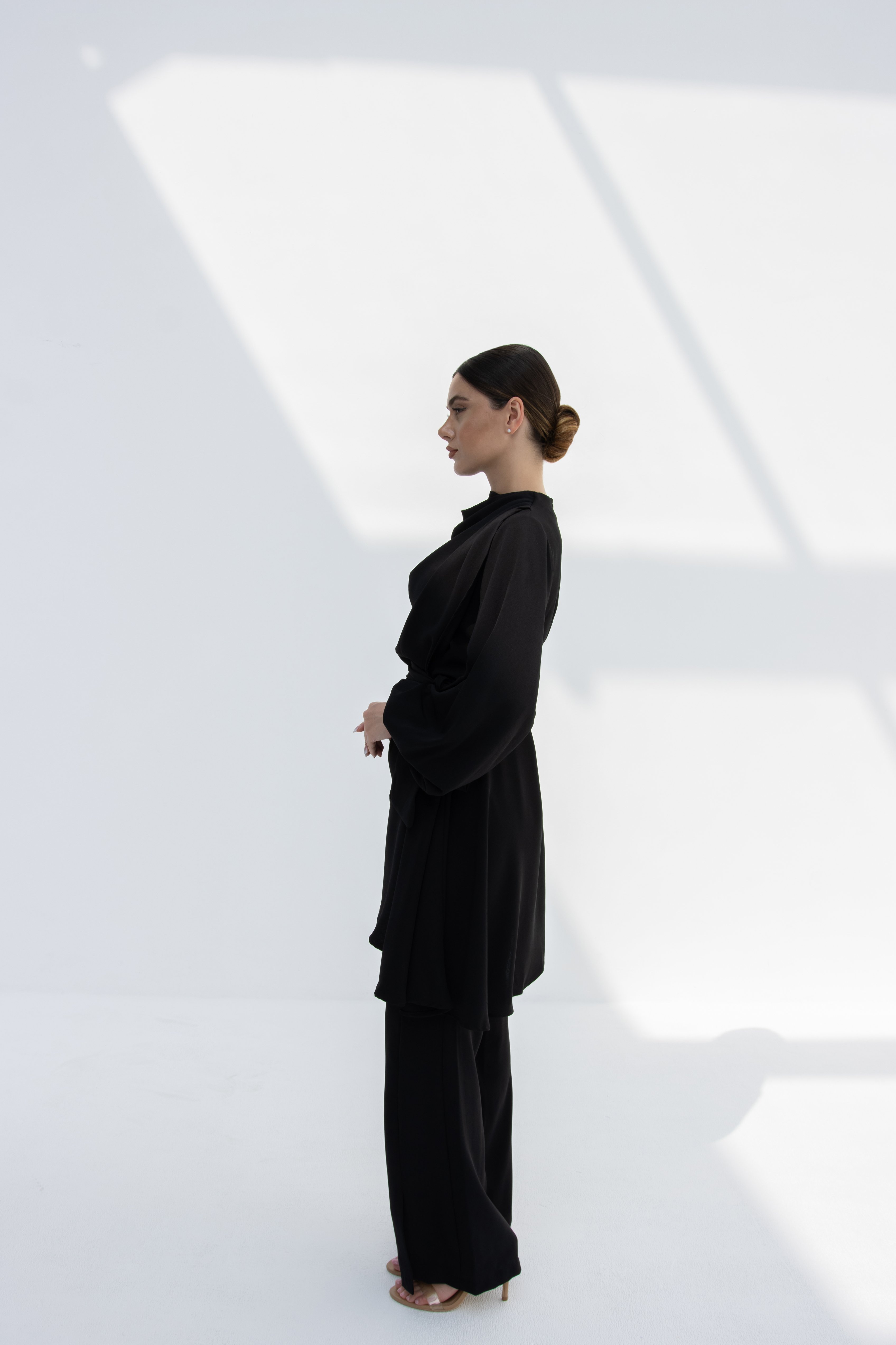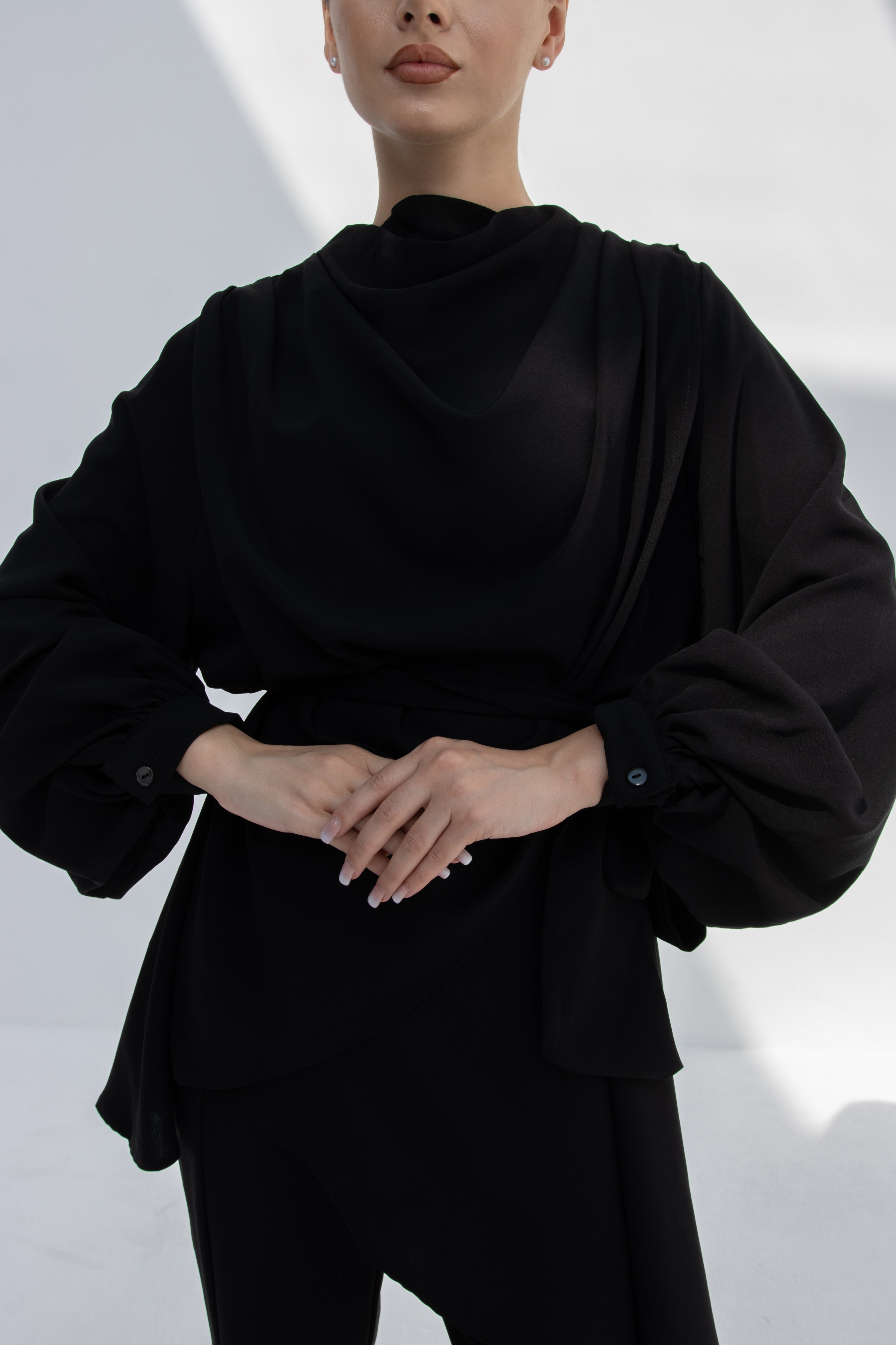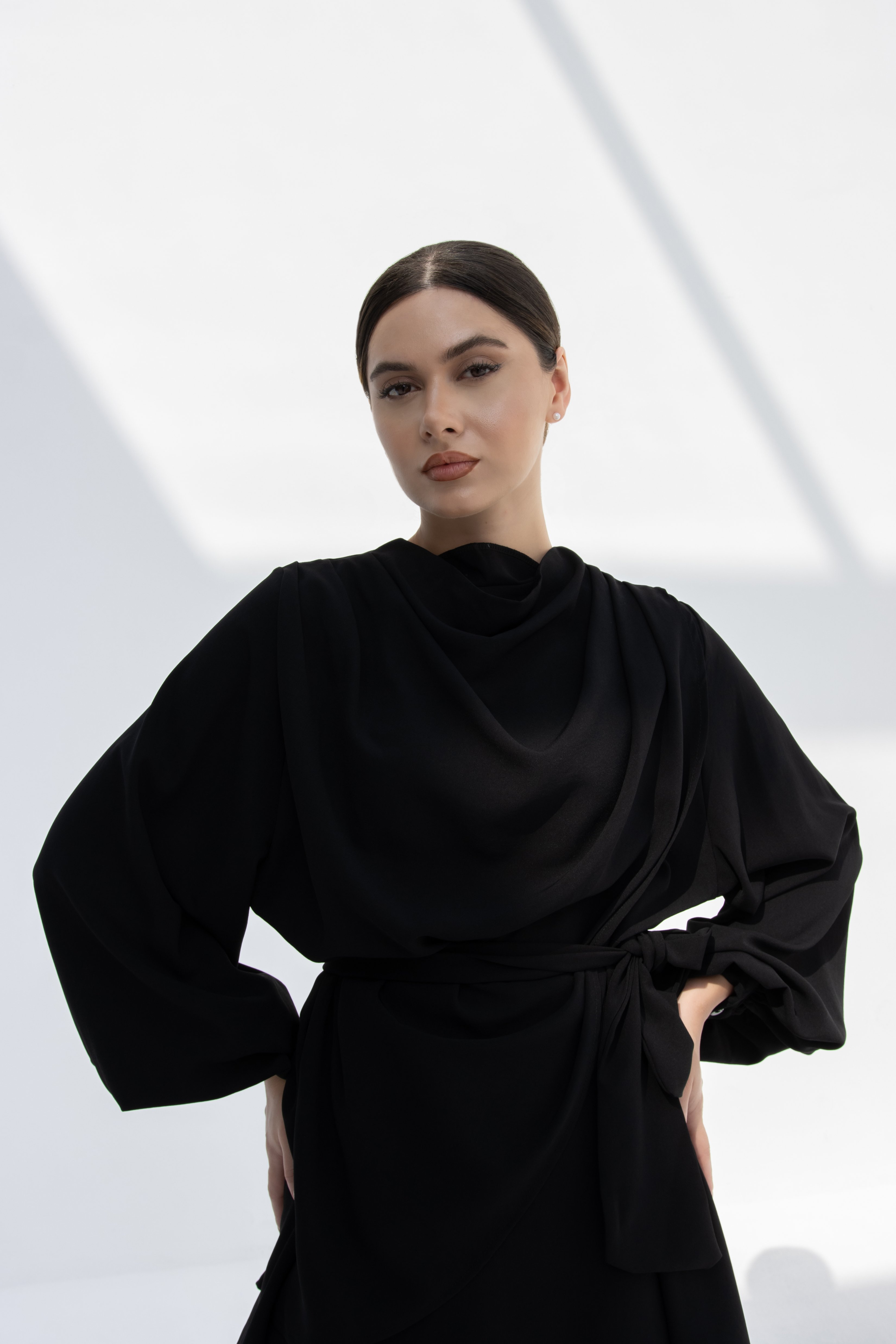 • تصميم بأكمام واسعة أنيقة، يوفر تغطية وراحة مع لمسة فخامة.