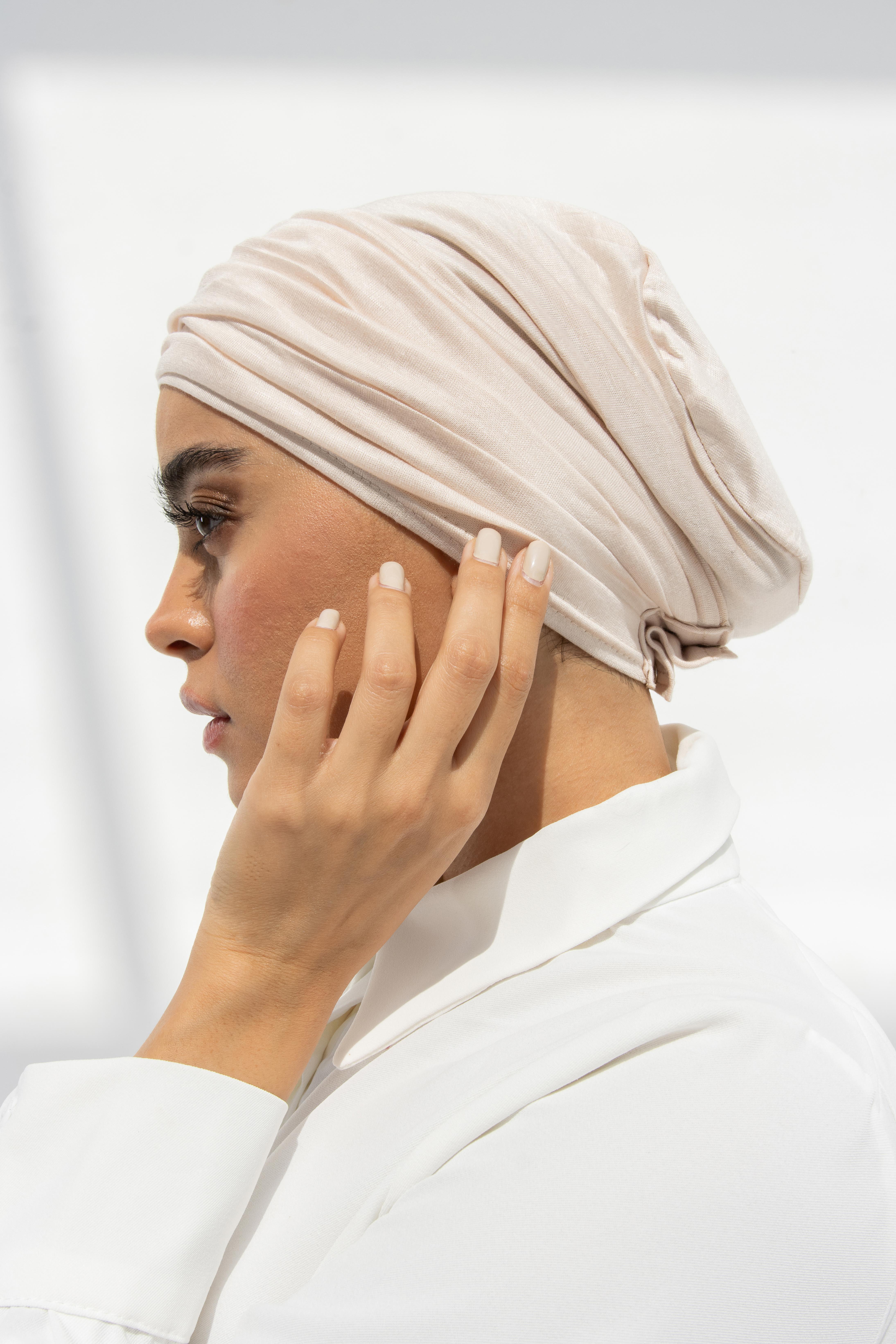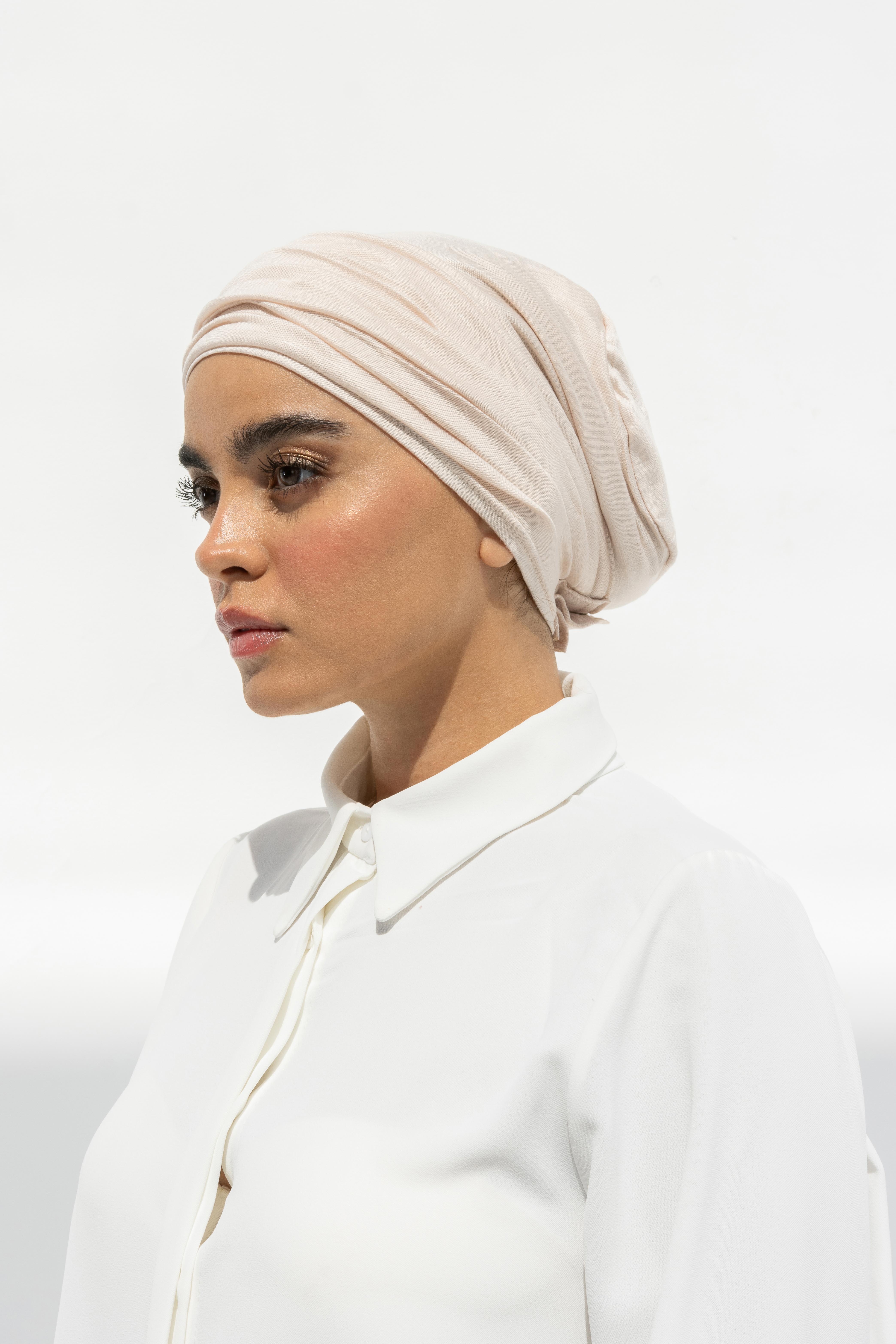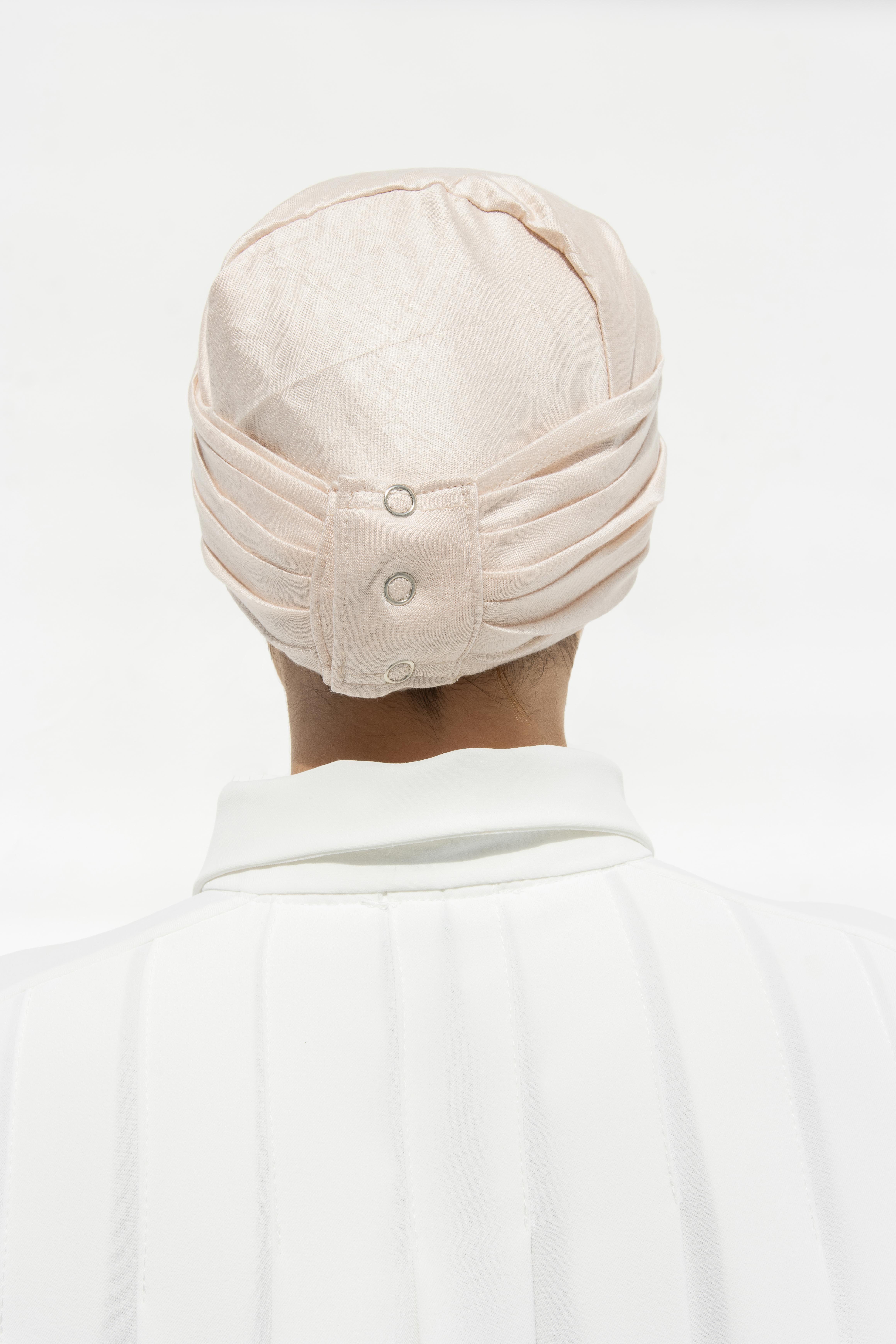 • هذه التوربان المكونة من قطعتين مصنوعة من خامة دبل سترتش فاخرة، مما يمنحها مظهرًا آسرًا وفاخرًا.