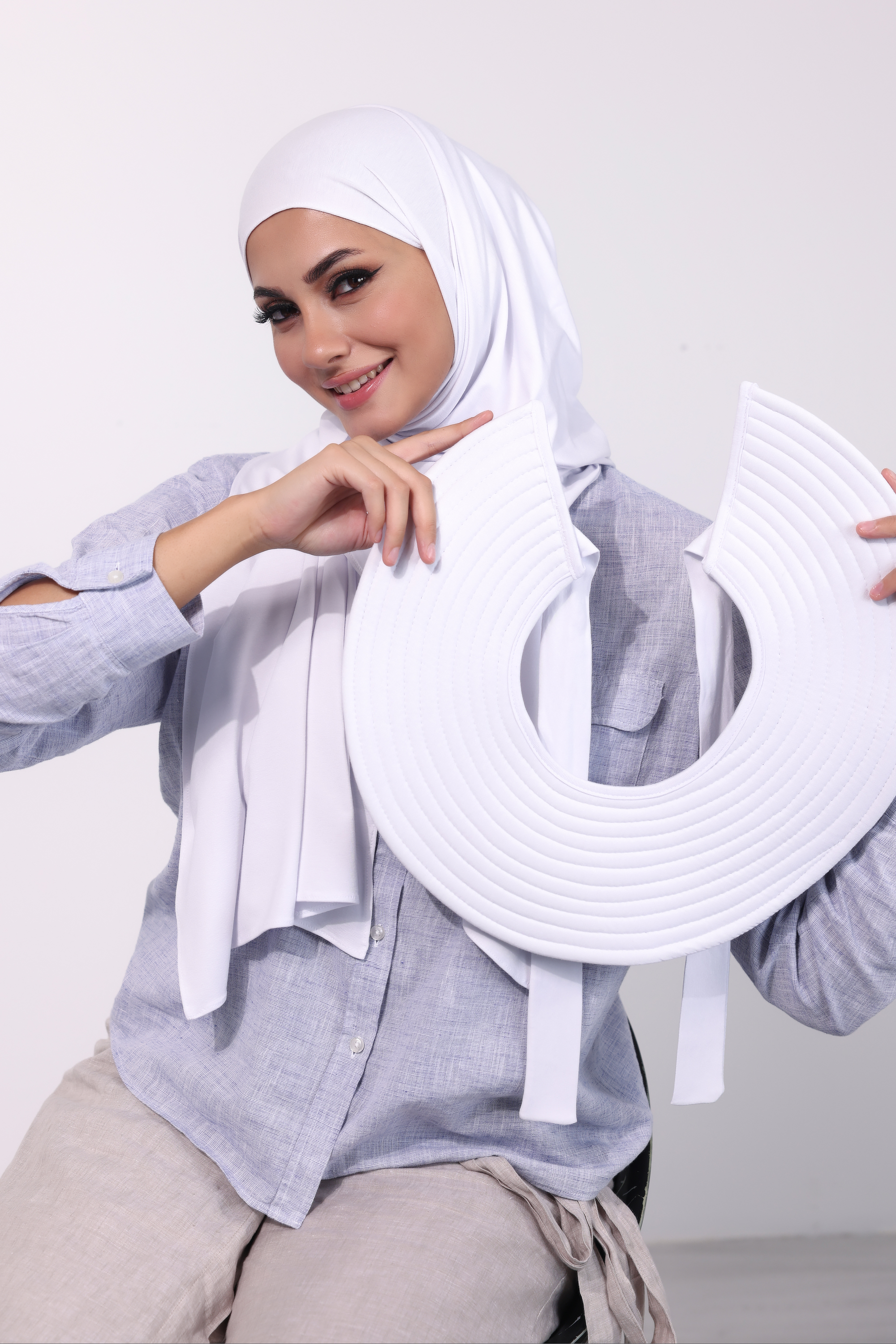 • قطعة خارجية تربط على الطرحة وخاصية الربط تتيح لك التحكم بالمقاس تستخدم هذي القطعة كقبعة تحمي الوجه والعين من أشعة الشمس القوية والضارة.