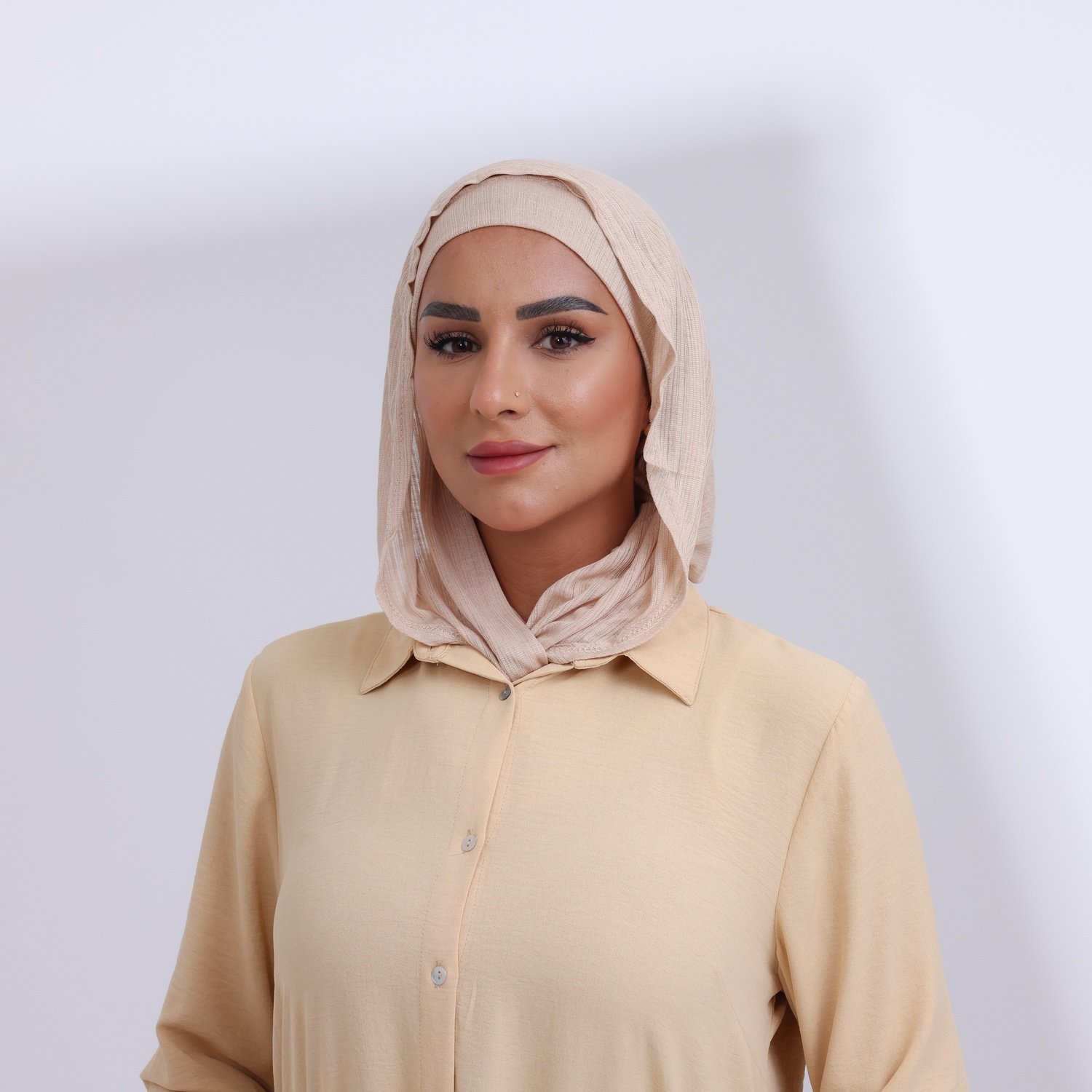 • القطعة الثانية: طرحة مفتوحة، مخيطة من الزاوية بحجم صغير ومدروس، يمنحك مظهرًا أنيقًا بتصميم “كأنّه مرتب من الداخل” (tucked-in look)، سواء ارتديته أسفل القميص أو فوقه.