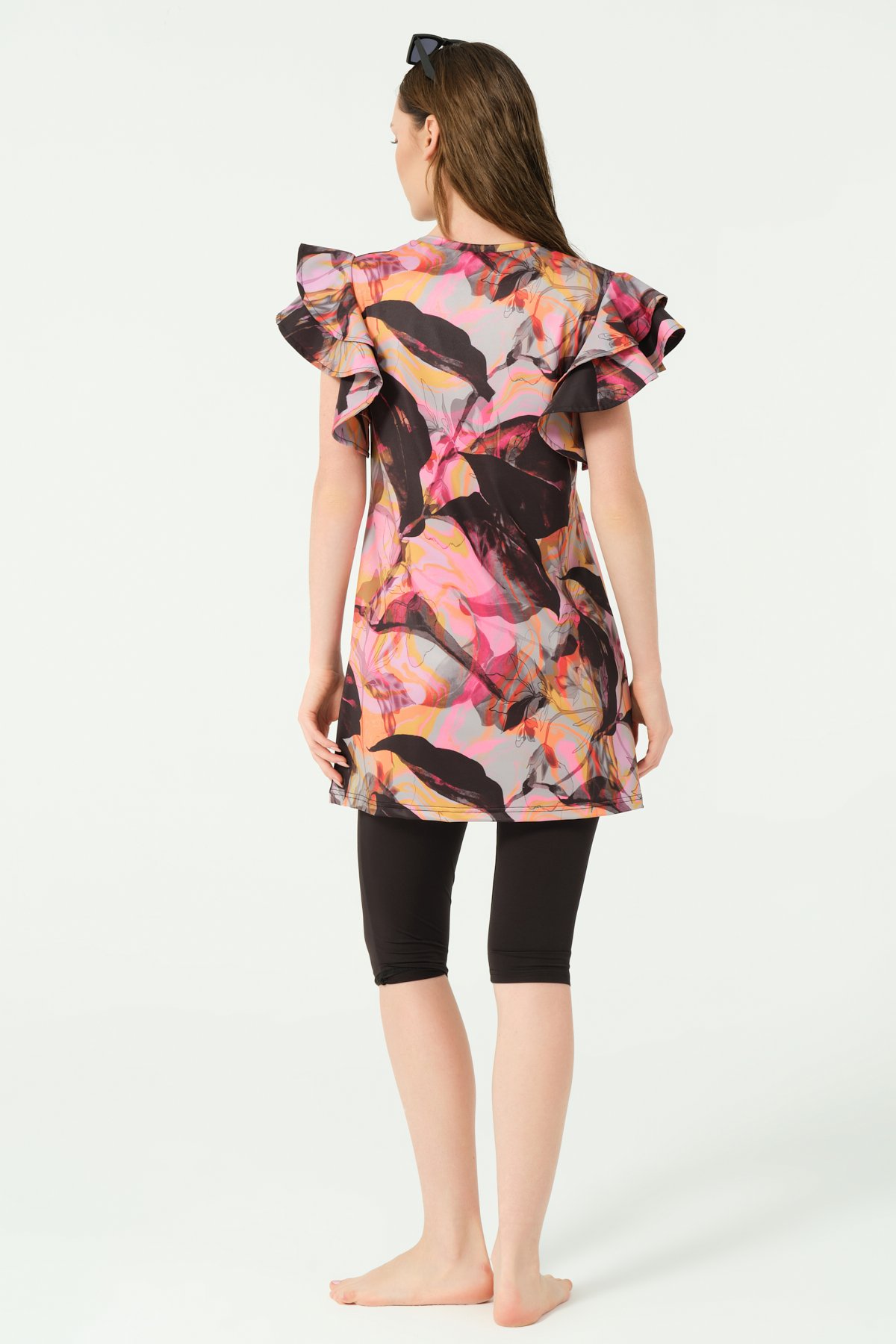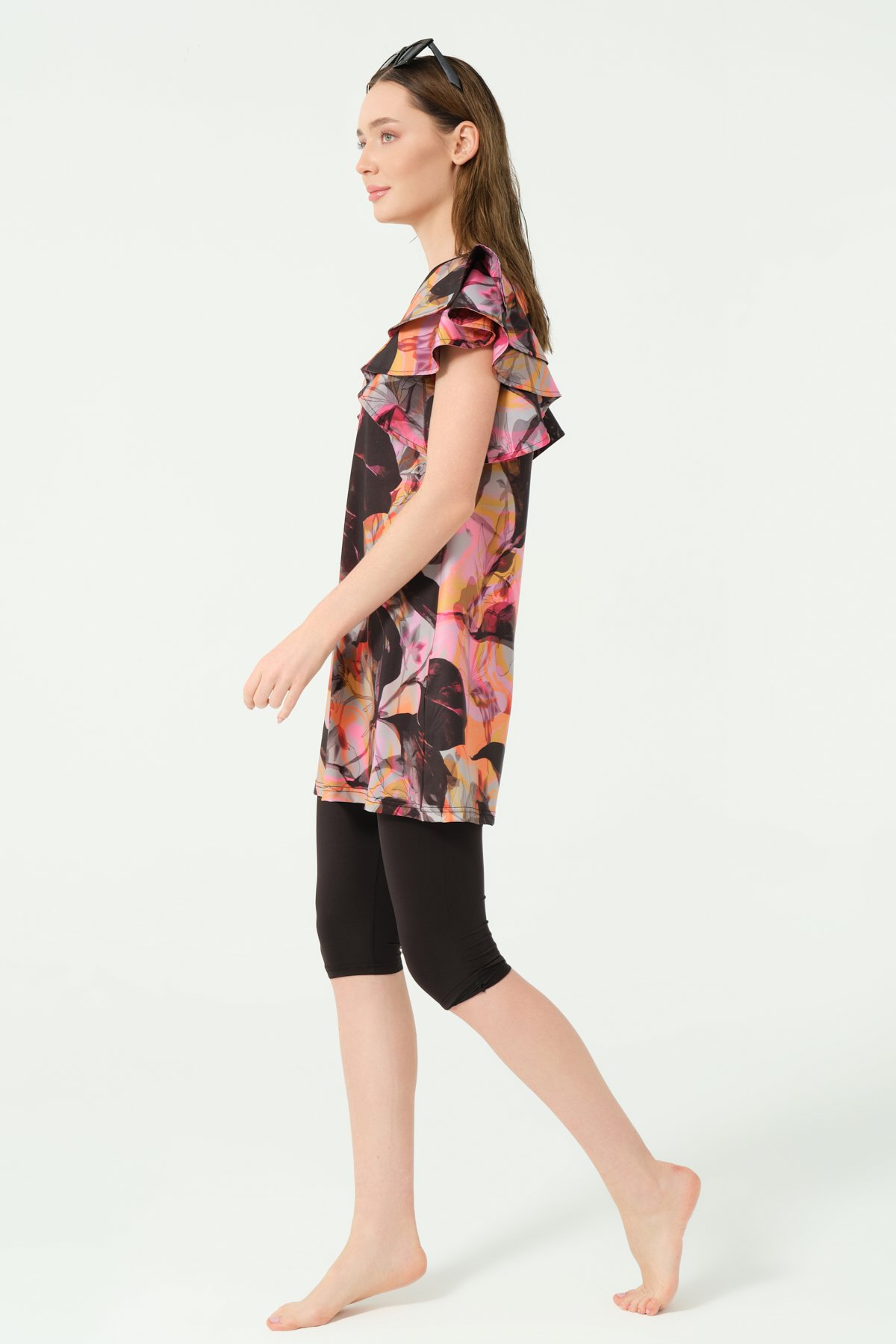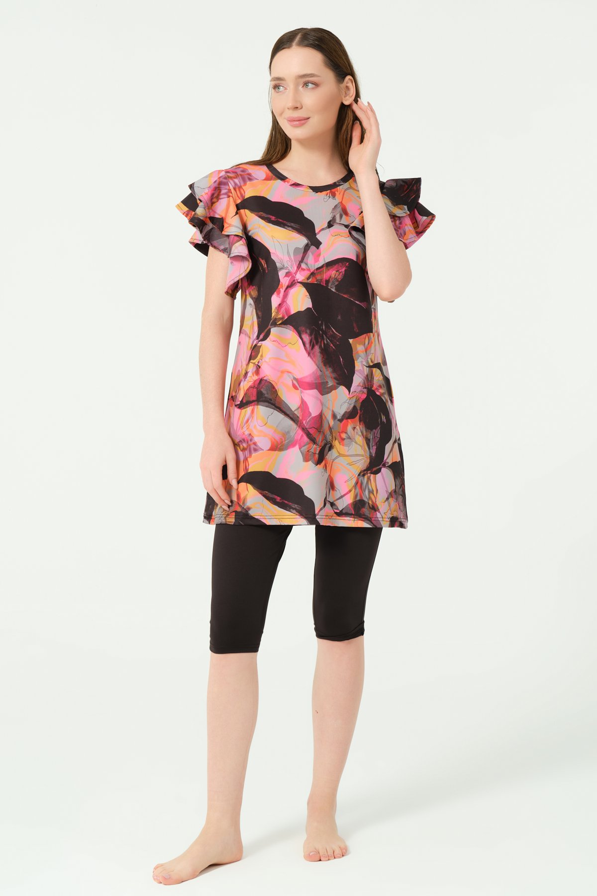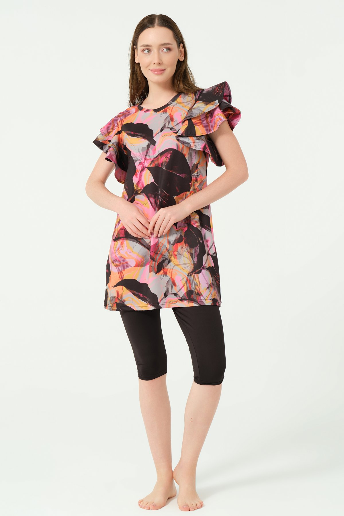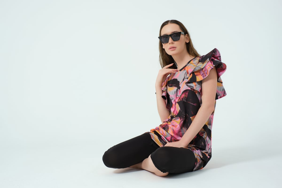 • توب بنقشة ملونة جذابة وأكمام كشكش