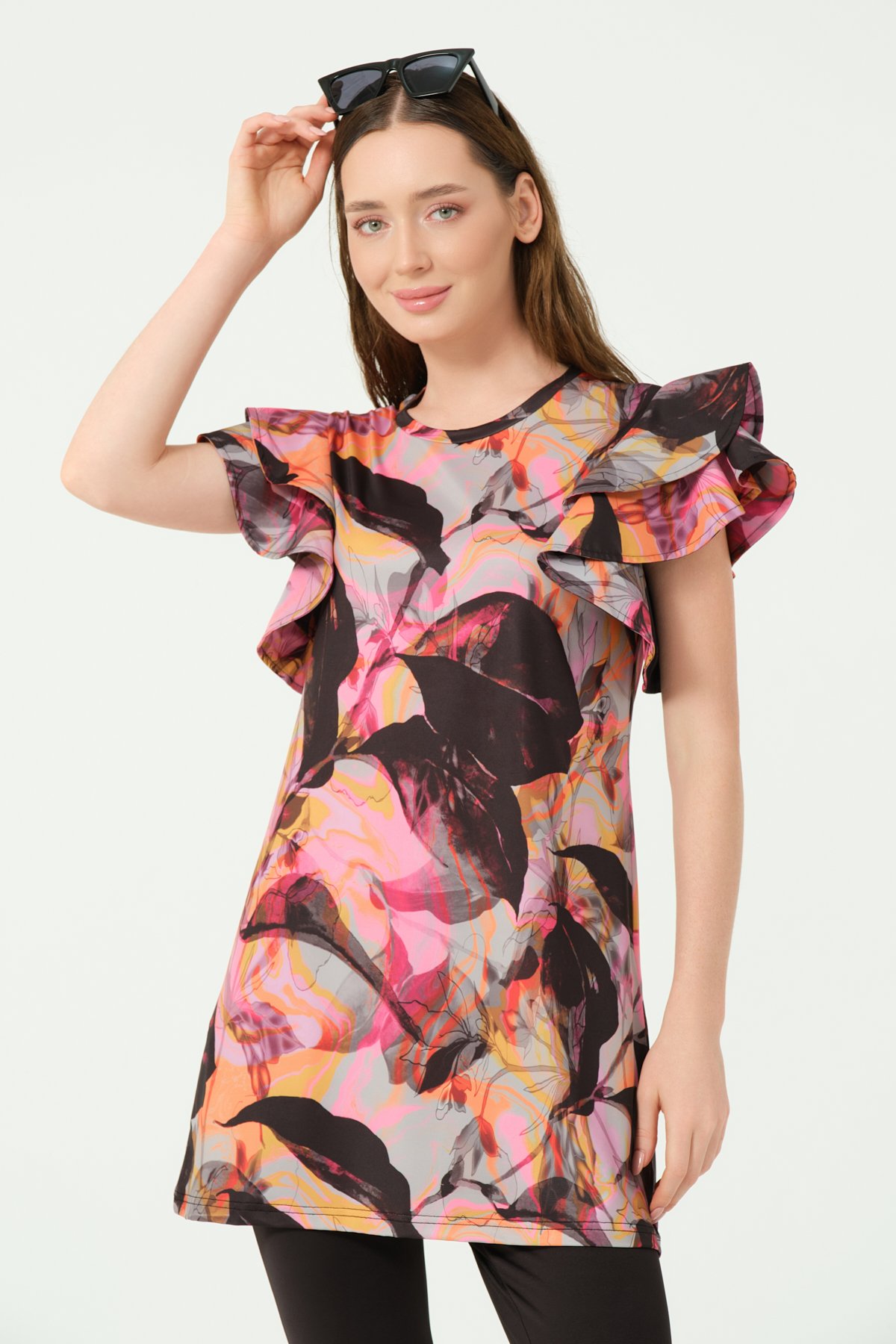 قطعة علوية بطبعة فنية أنيقة وأكمام كشكش مزدوجة تمنحك طابعًا أنثويًا ملفتًا مع ياقة دائرية مريحة.