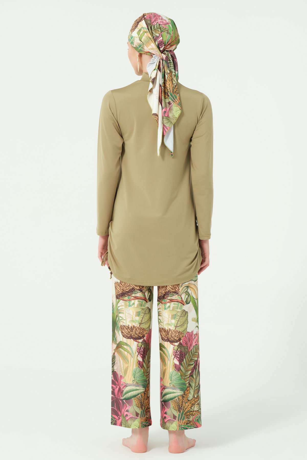 استمتعي بالسباحة بأناقة وراحة تامة مع طقم السباحة هذا الأنيق والمحتشم المكوّن من 4 قطع.