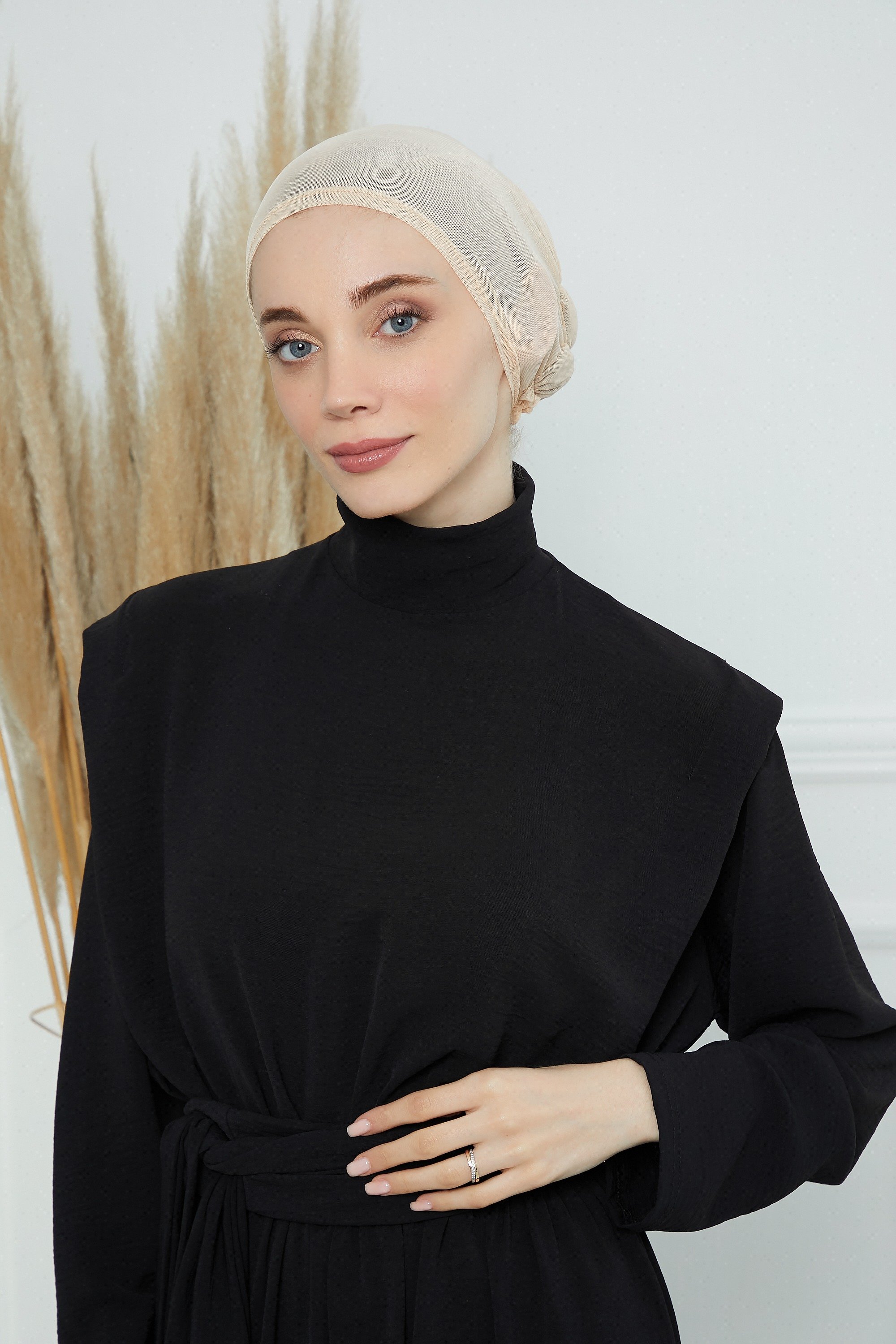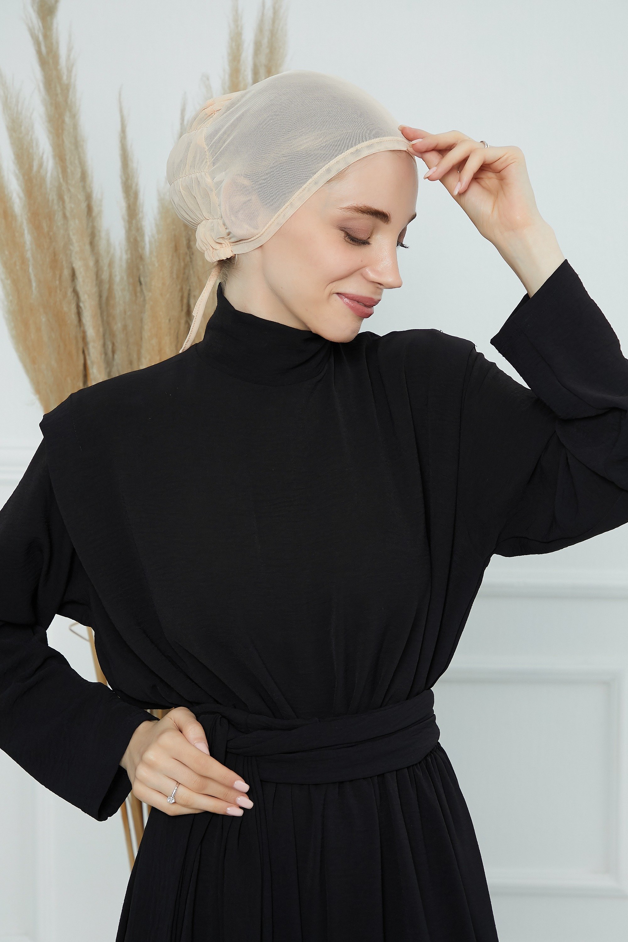 قبعة تحت الحجاب خفيفة وشفافة هي قطعة لتثبيت التوربان أو الحجاب وَ هي من القطع الأساسية وَ المهمة لثبات حجابك فهي تمنحك الثقة والراحة في الحركة دون القلق من انزلاق الحجاب أو تحركه، شفافة جدًا وخفيفة بها خيط من الخلف للتحكم بالمقاس وتثبيت القبعة باللبس، عملية وَ مثالية للارتداء طوال اليوم.