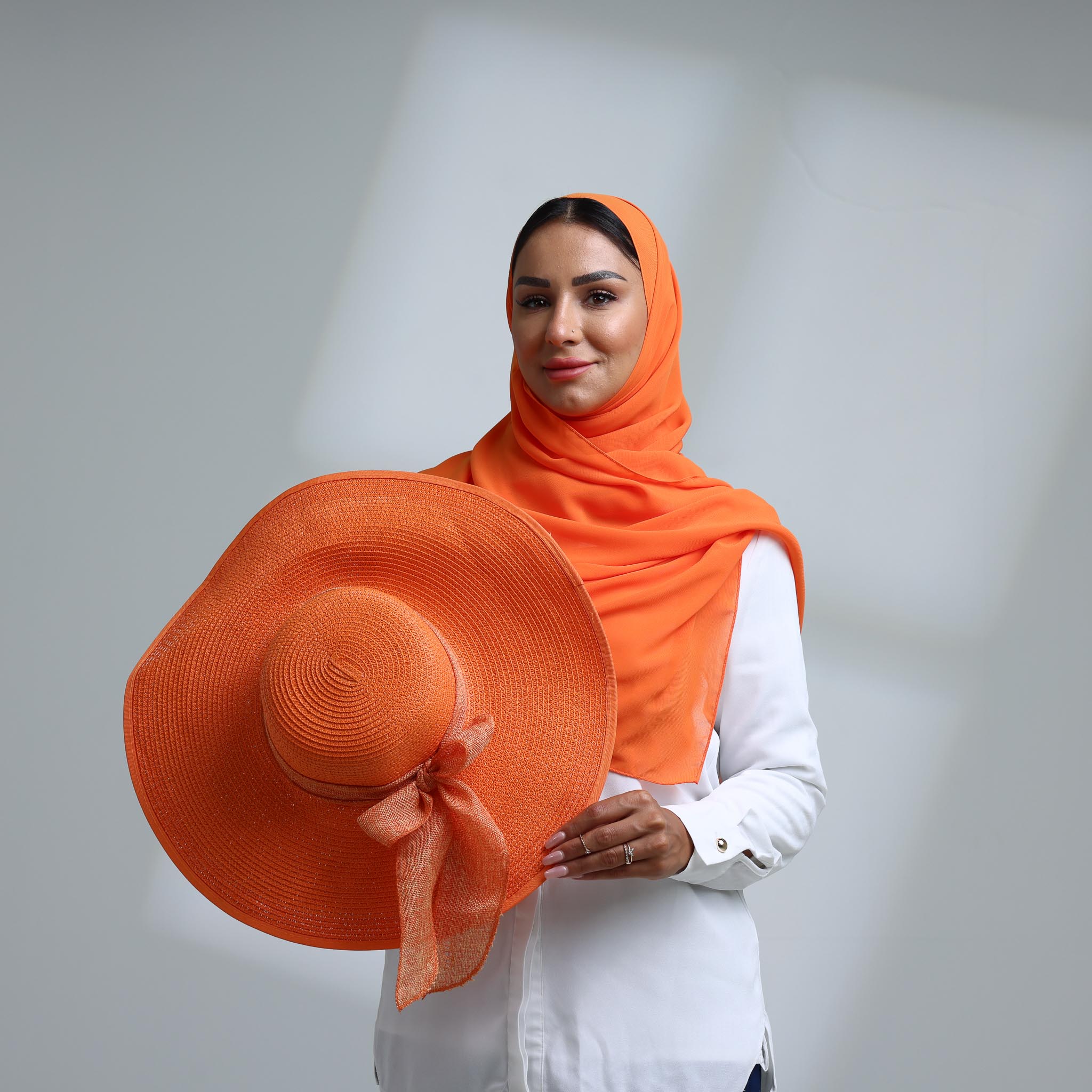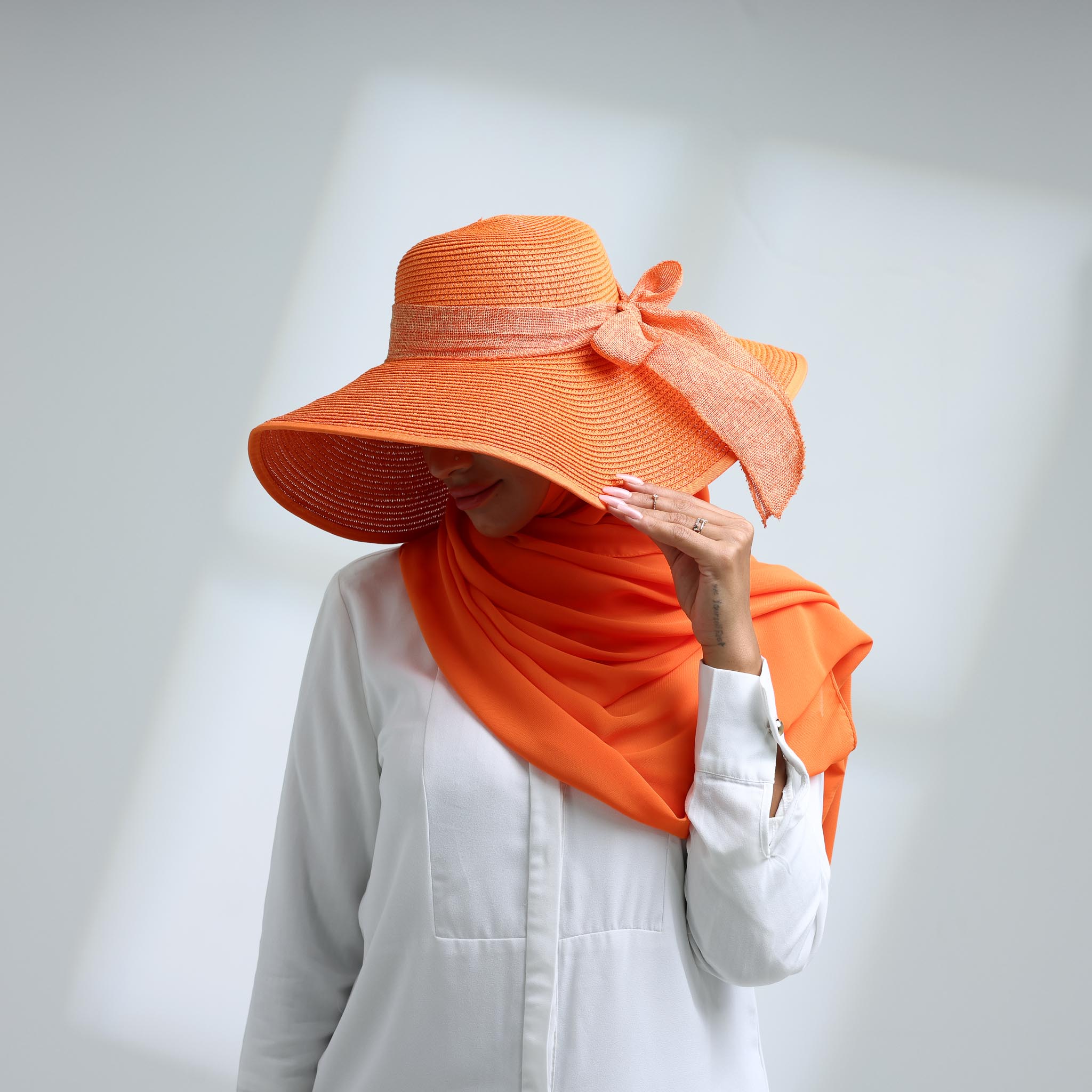 • حجاب كامل مصمم ليغطي الشعر والرقبة مصنوع من خامة شيفون صيفية بنفس لون القبعة.