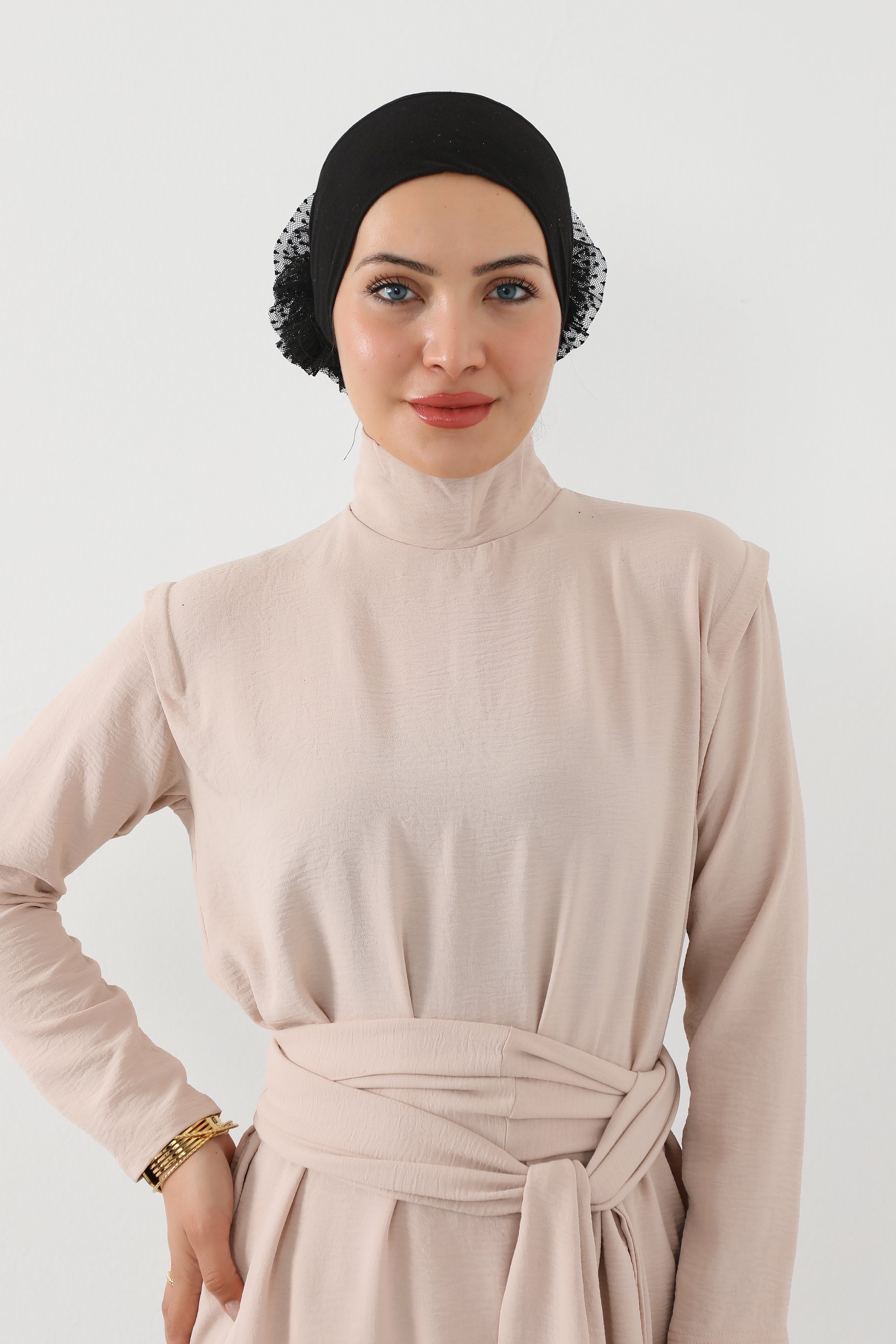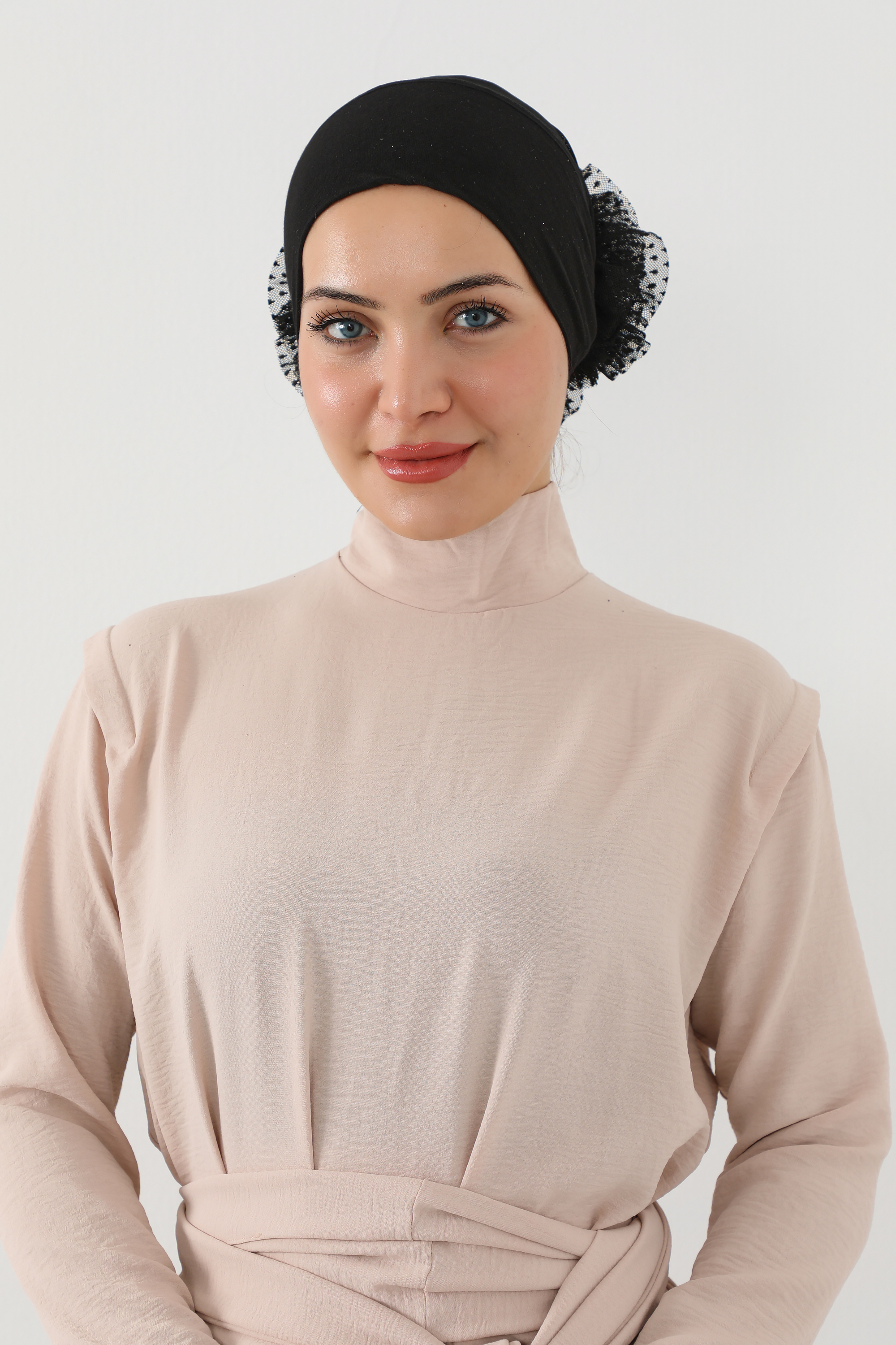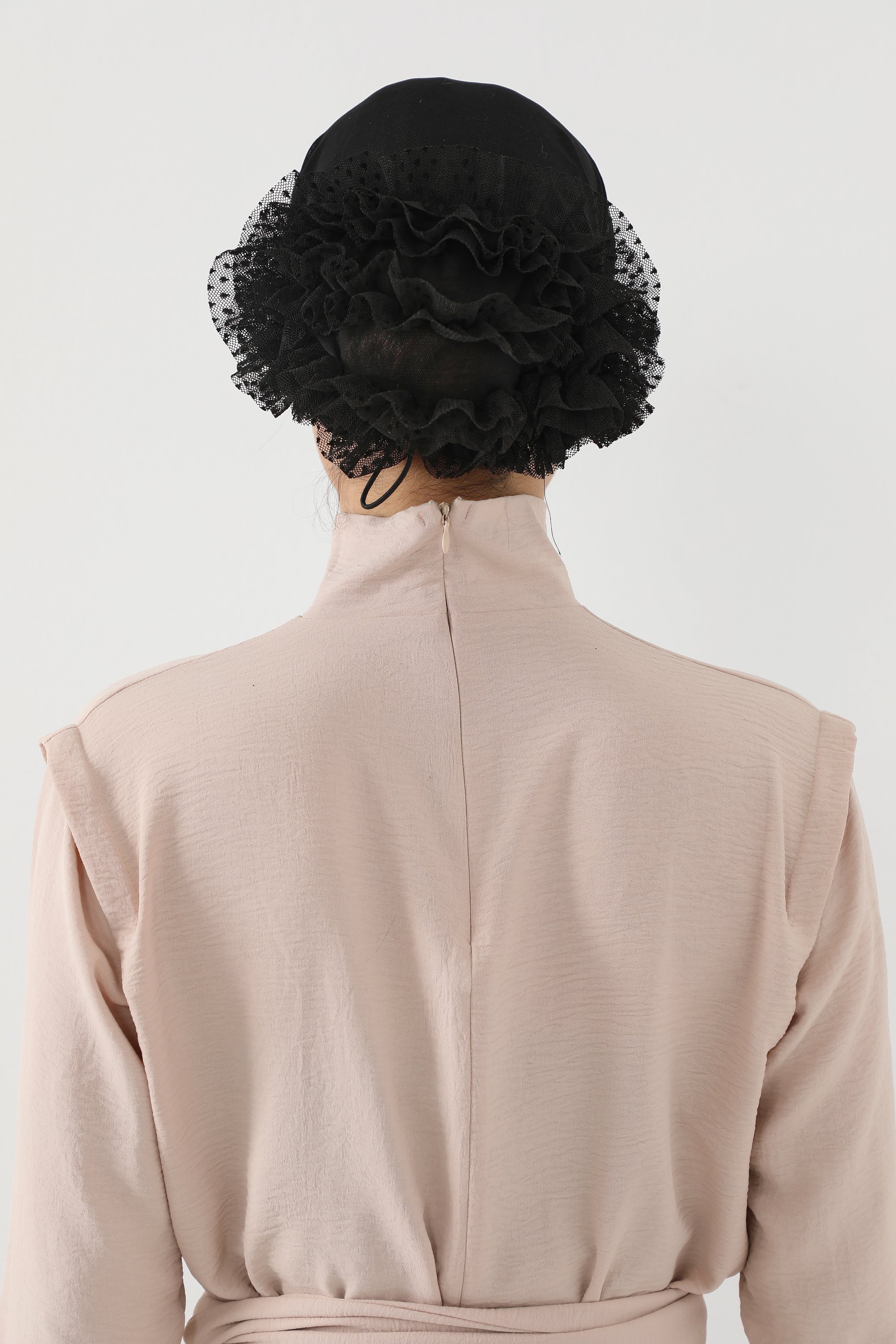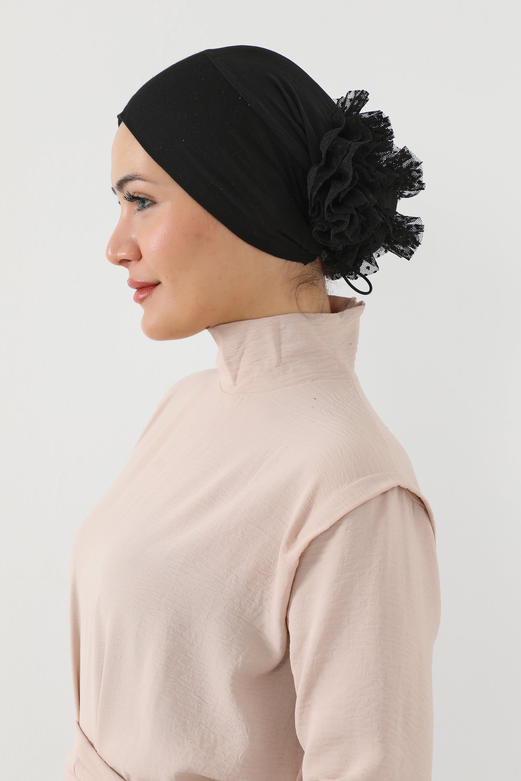 • تصميم خلفي أنيق من الدانتيل: يضيف حجم ممتاز للرأس ويُساعد على تثبيت الحجاب أو التوربان بشكل مثالي.