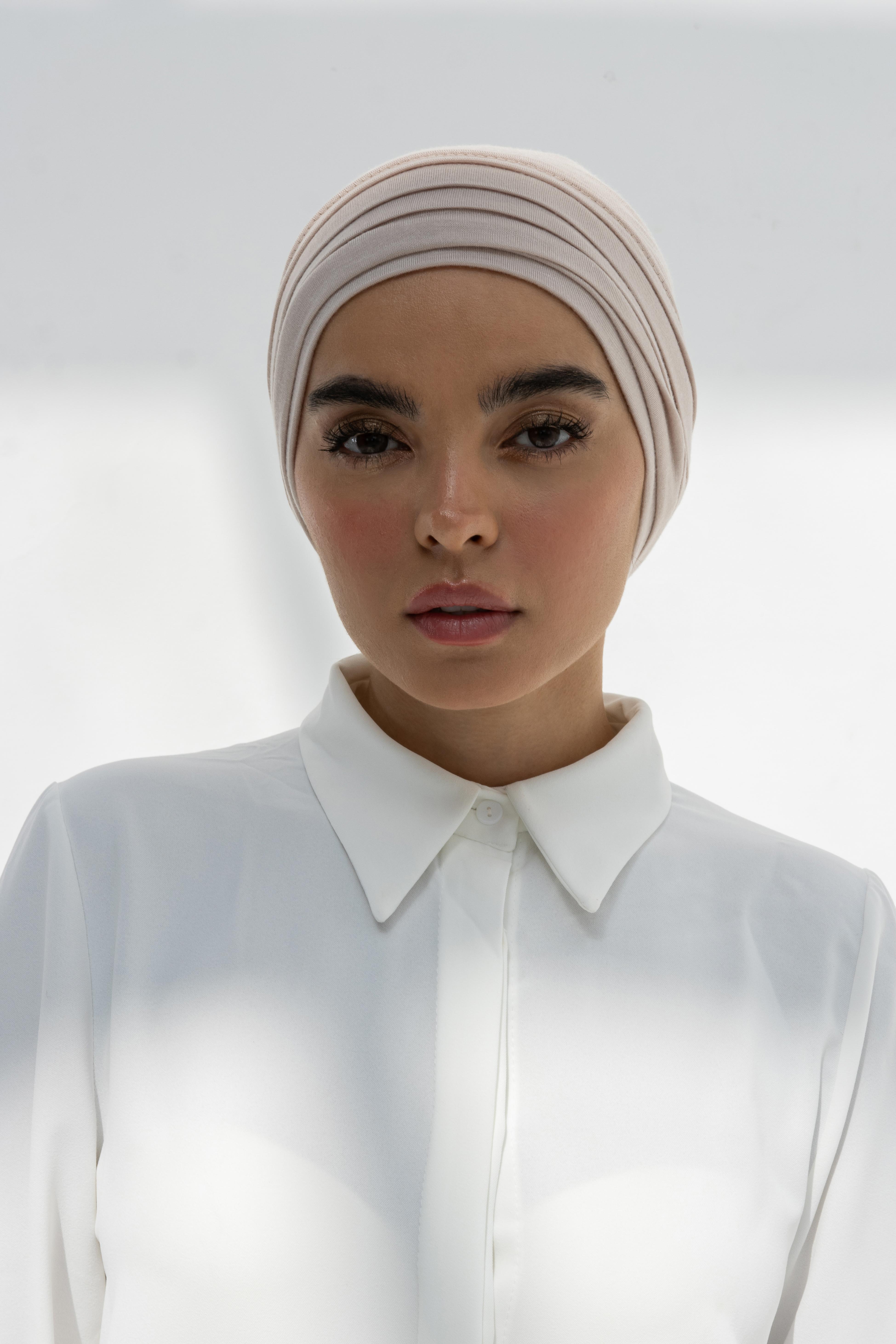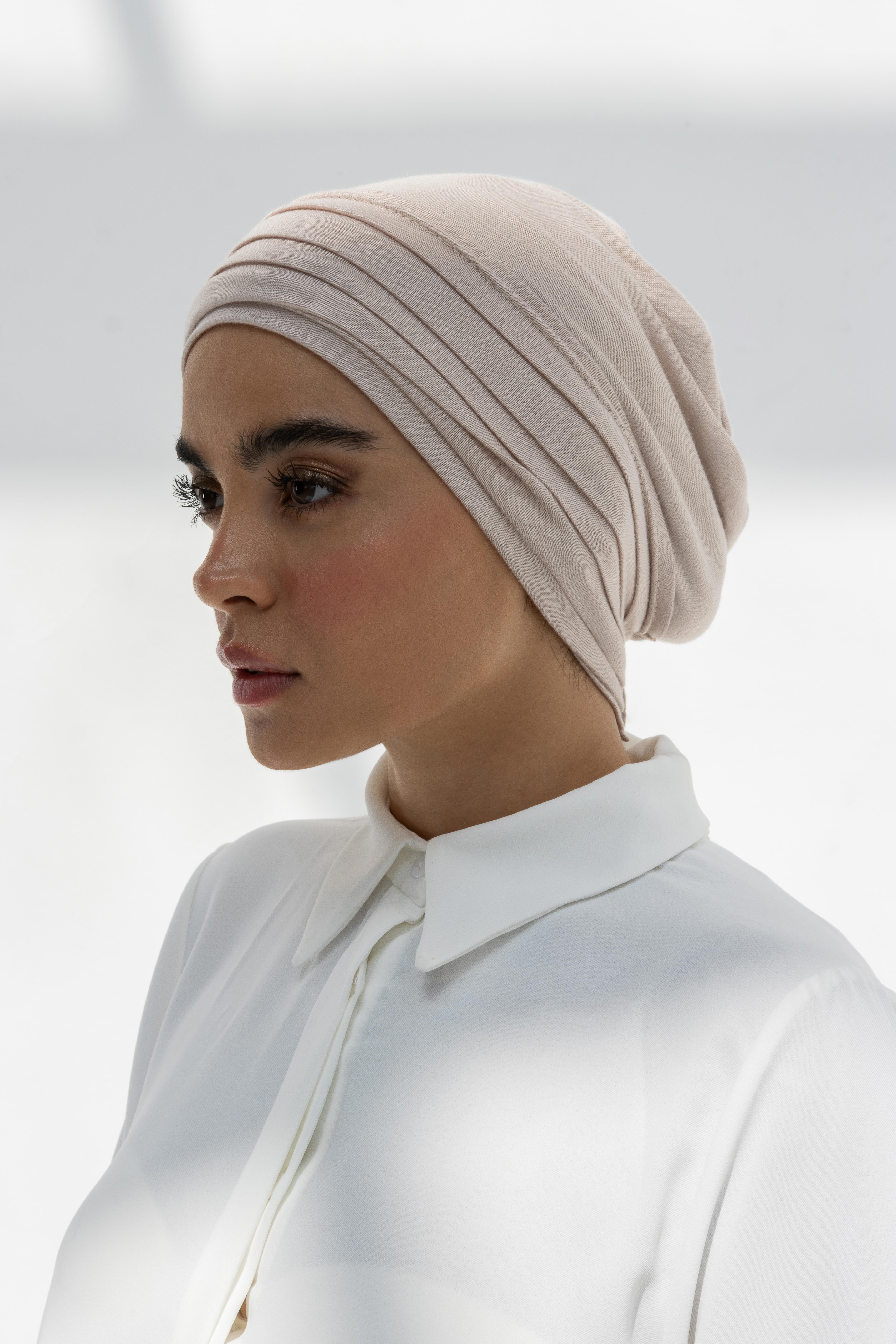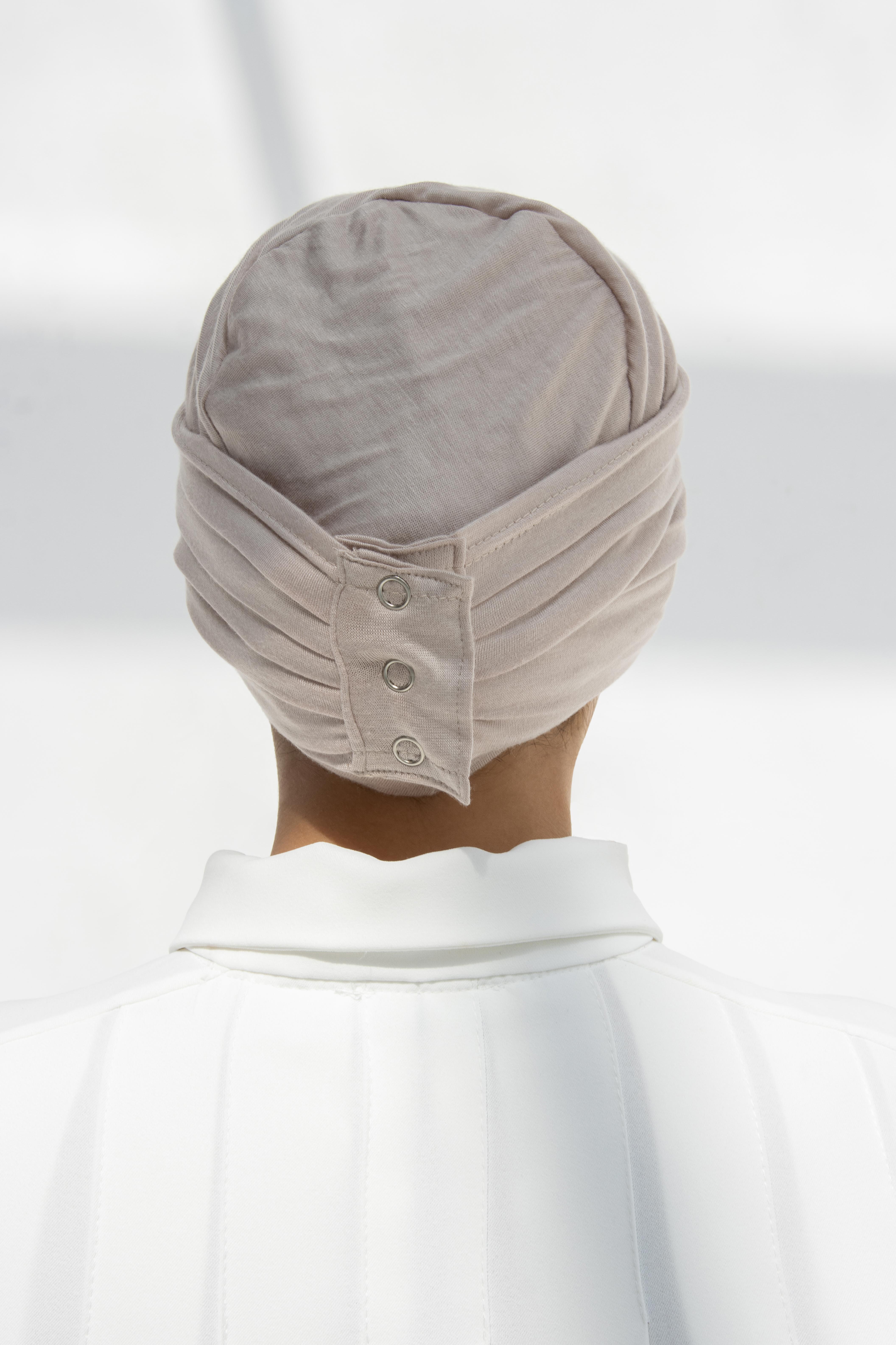 - هذه التوربان المكونة من قطعتين مصنوعة من خامة دبل سترتش فاخرة، مما يمنحها مظهرًا غنيًا وفاخرًا.