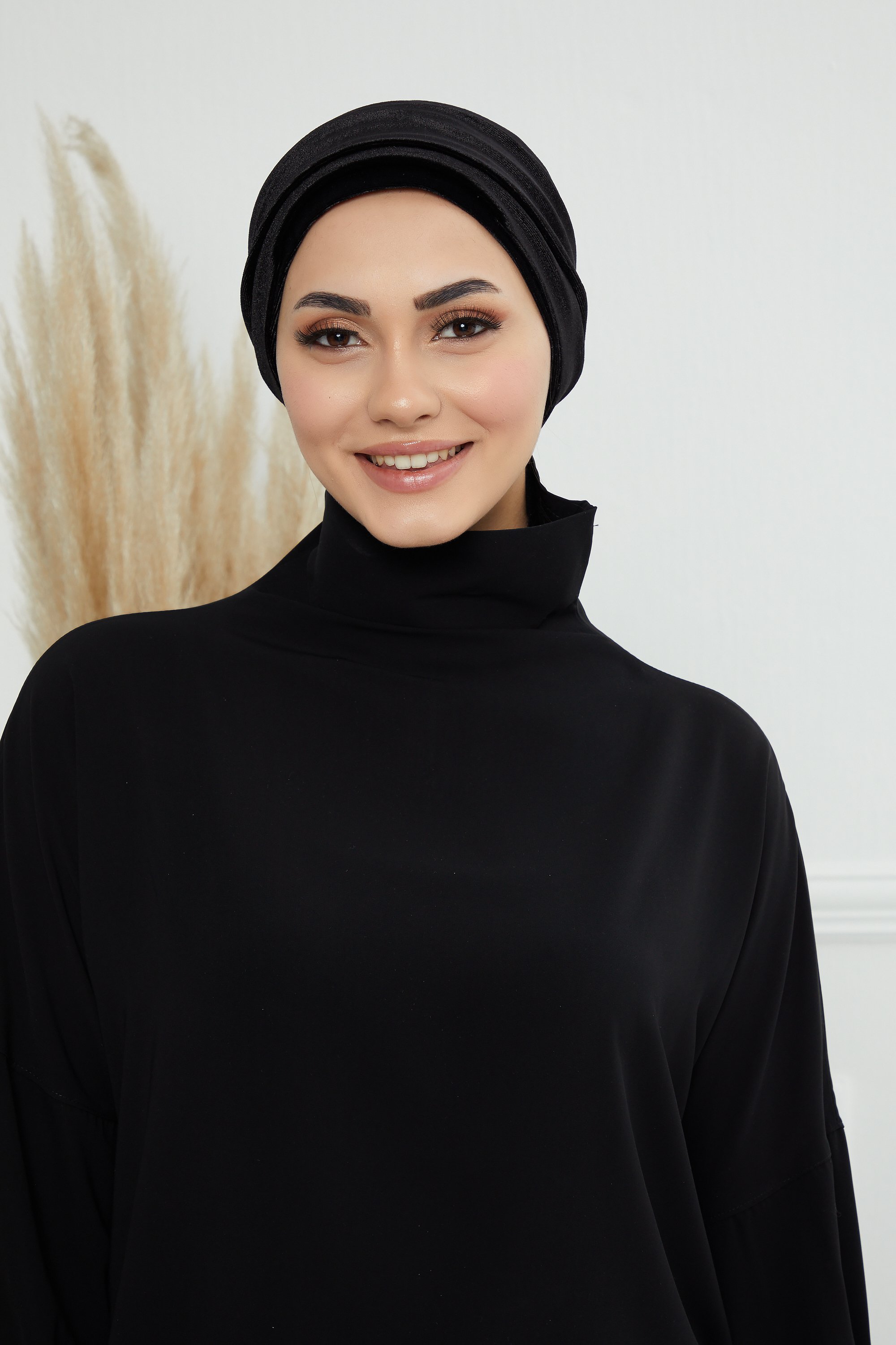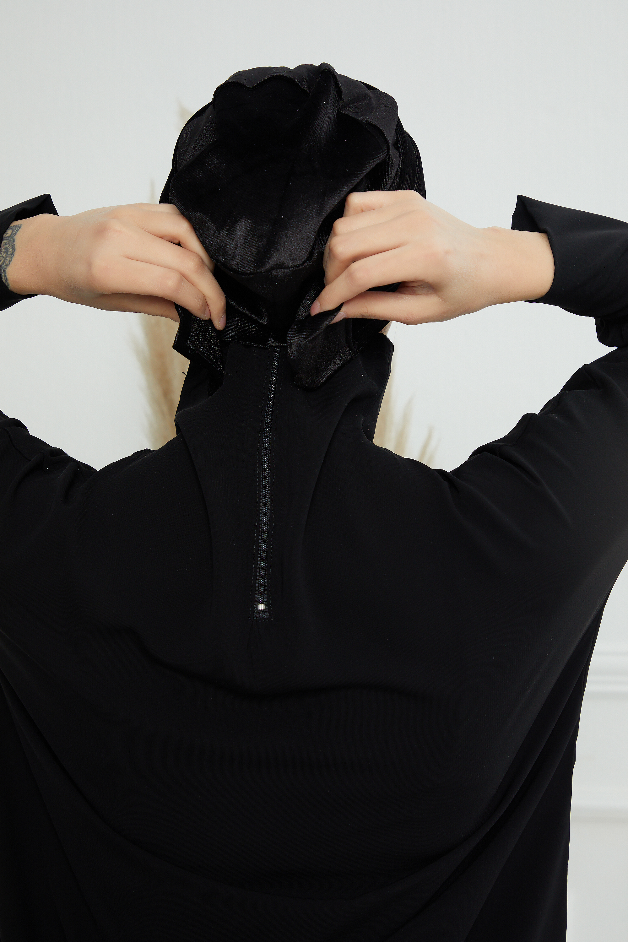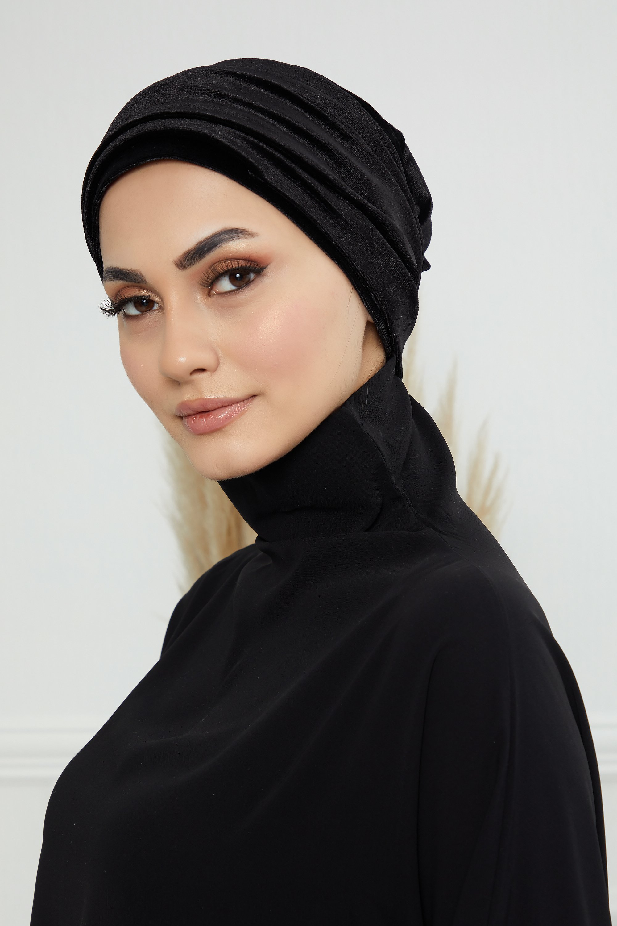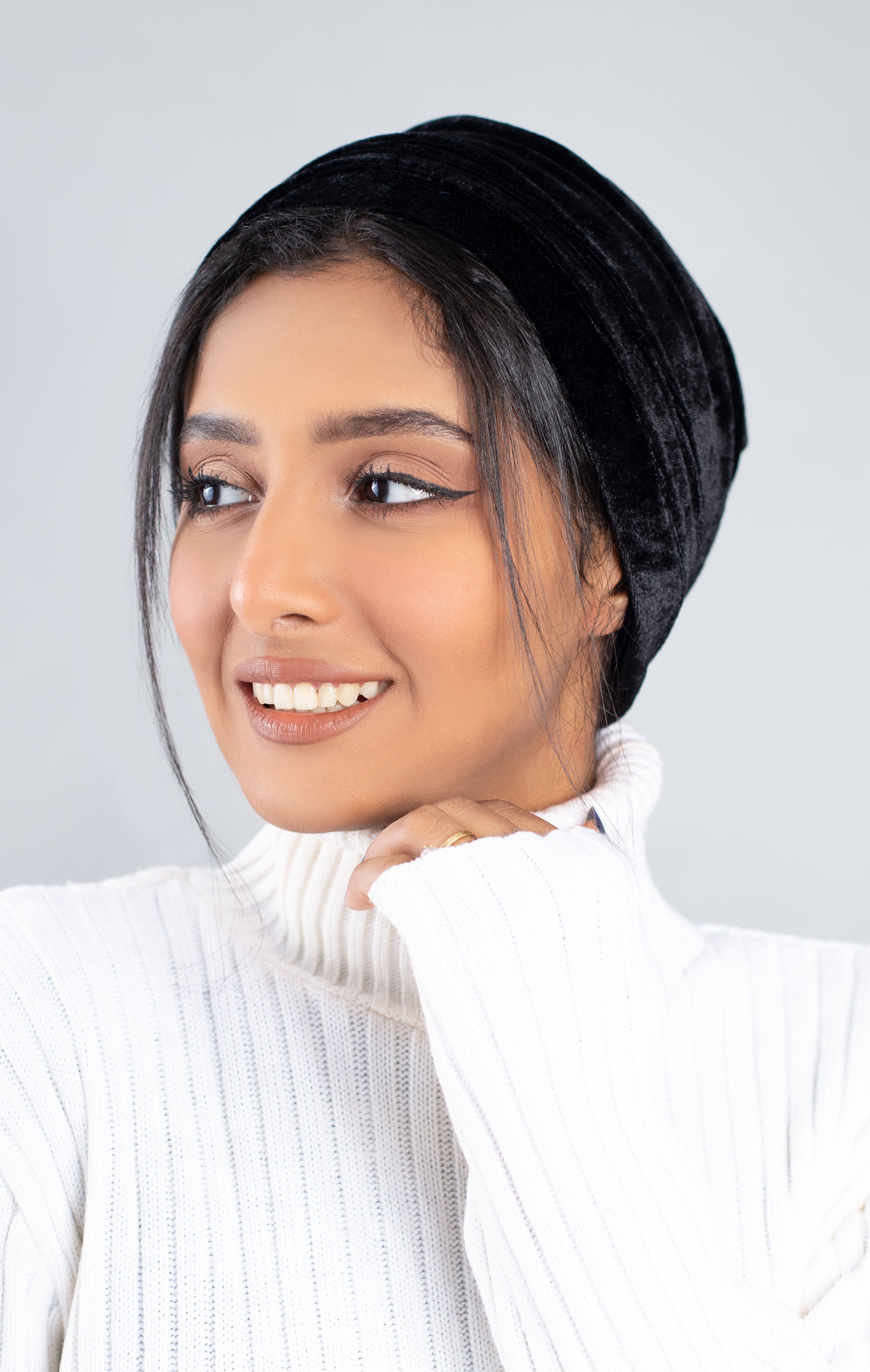 This comfortable turban is made from soft velvet fabric and features a wide band that wraps around the head to secure it.