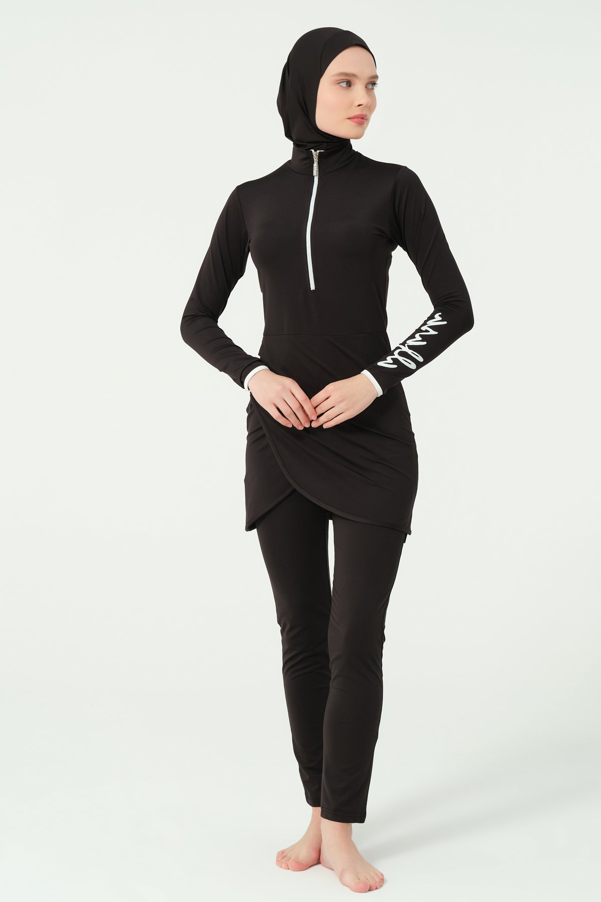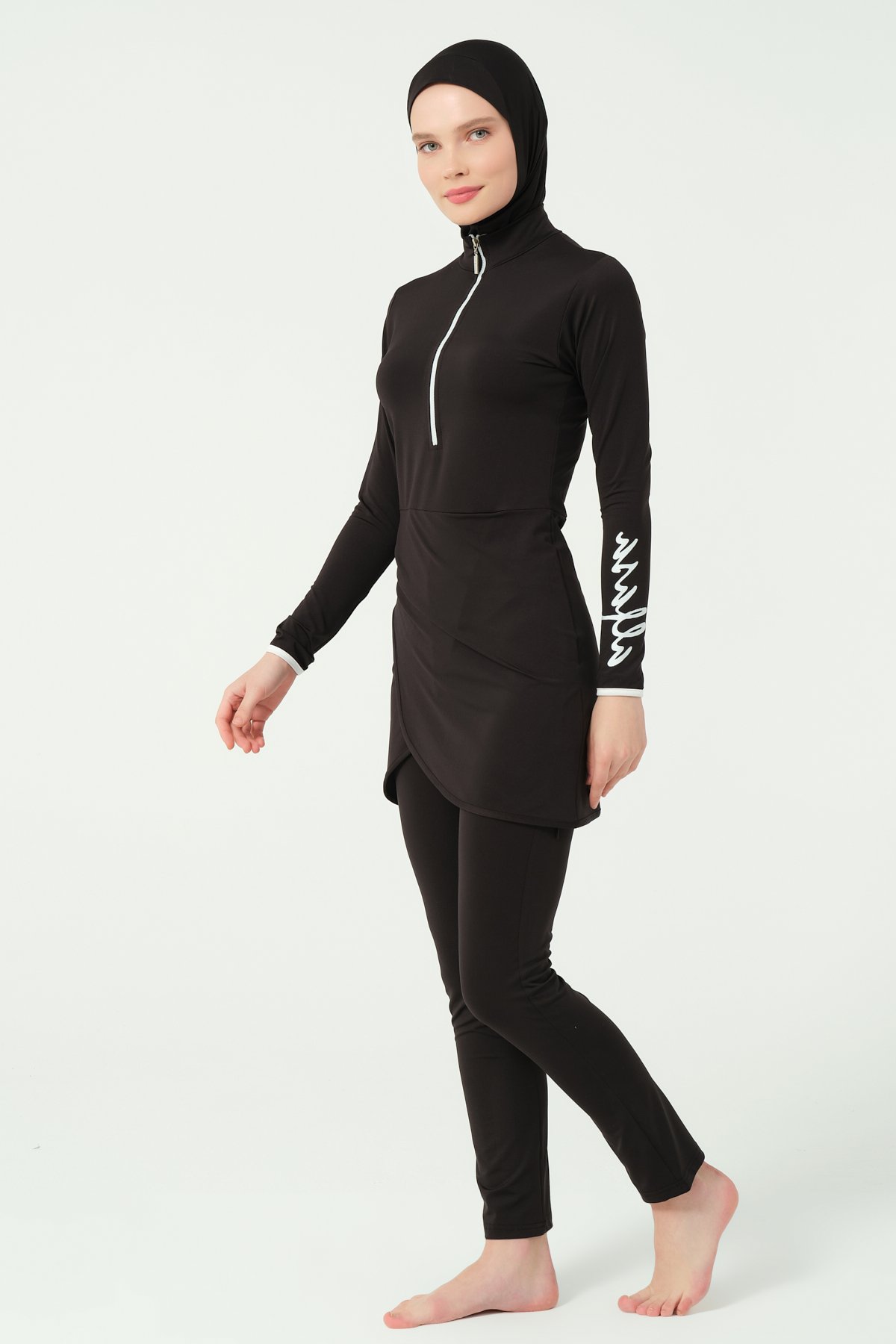 يتكوّن من أربع قطع: توب بأكمام طويلة وسحاب أمامي لسهولة اللبس، بنطال ضيق، غطاء رأس، وقطعة داخلية متصلة، مما يوفّر تغطية شاملة وحركة مرنة أثناء السباحة.