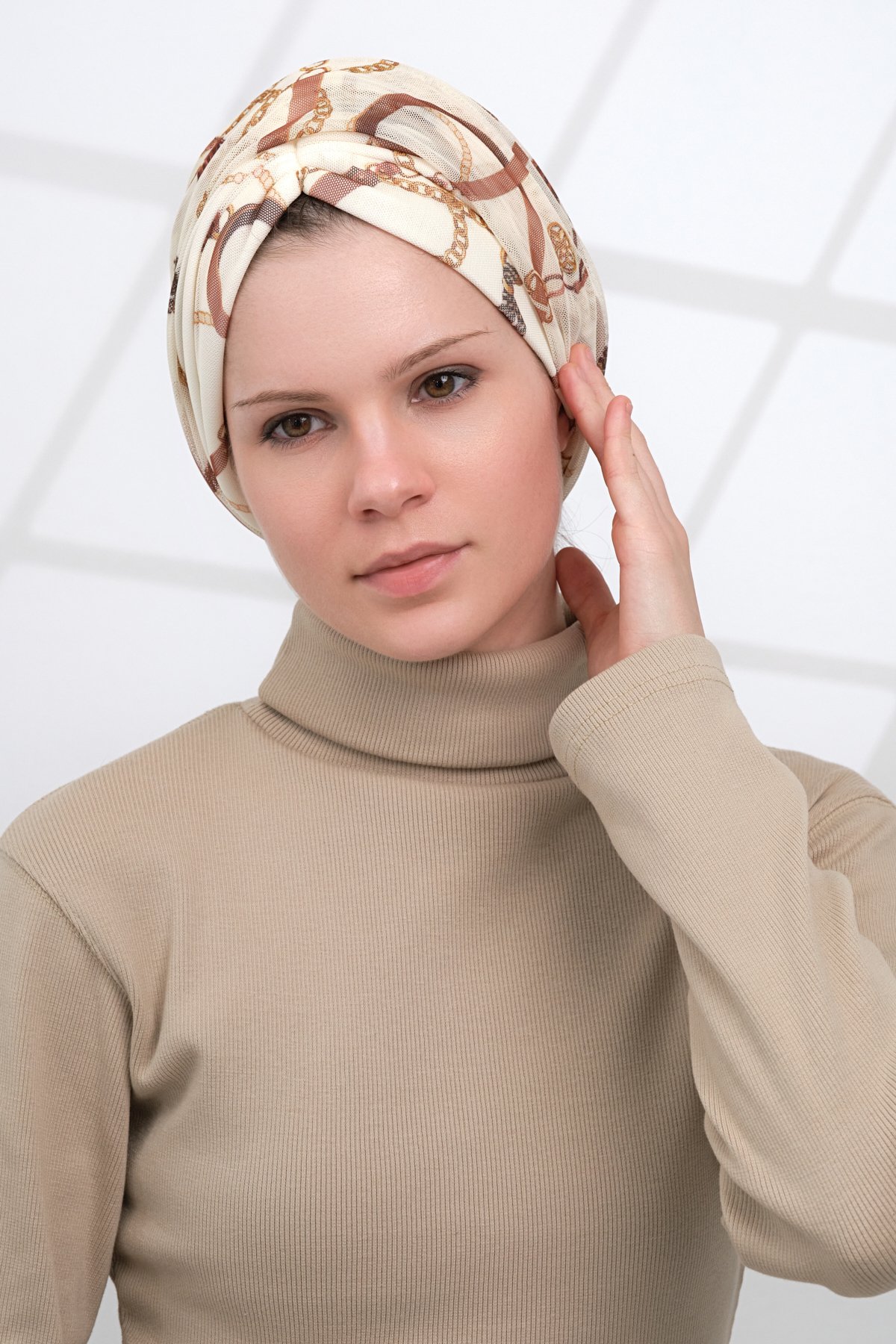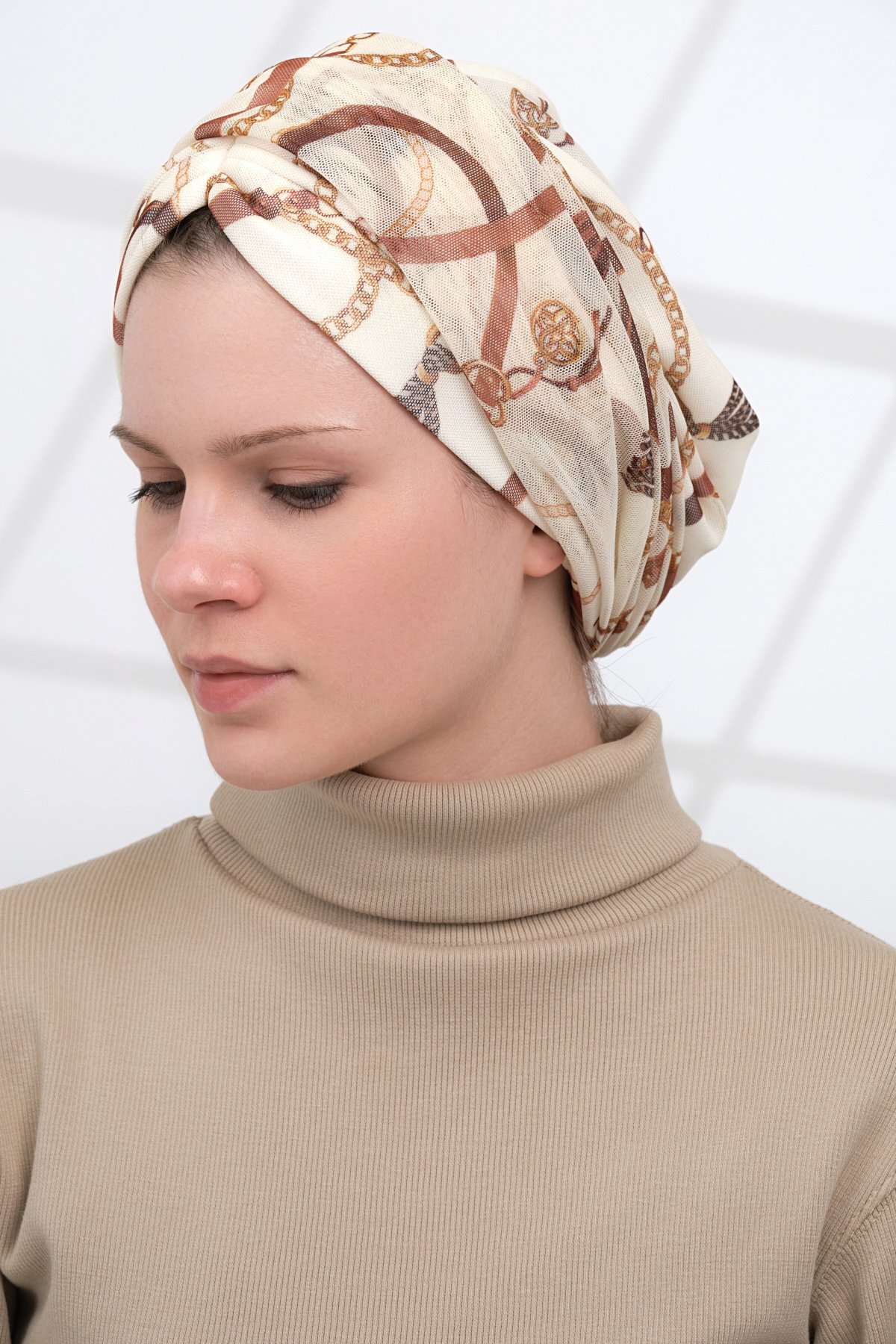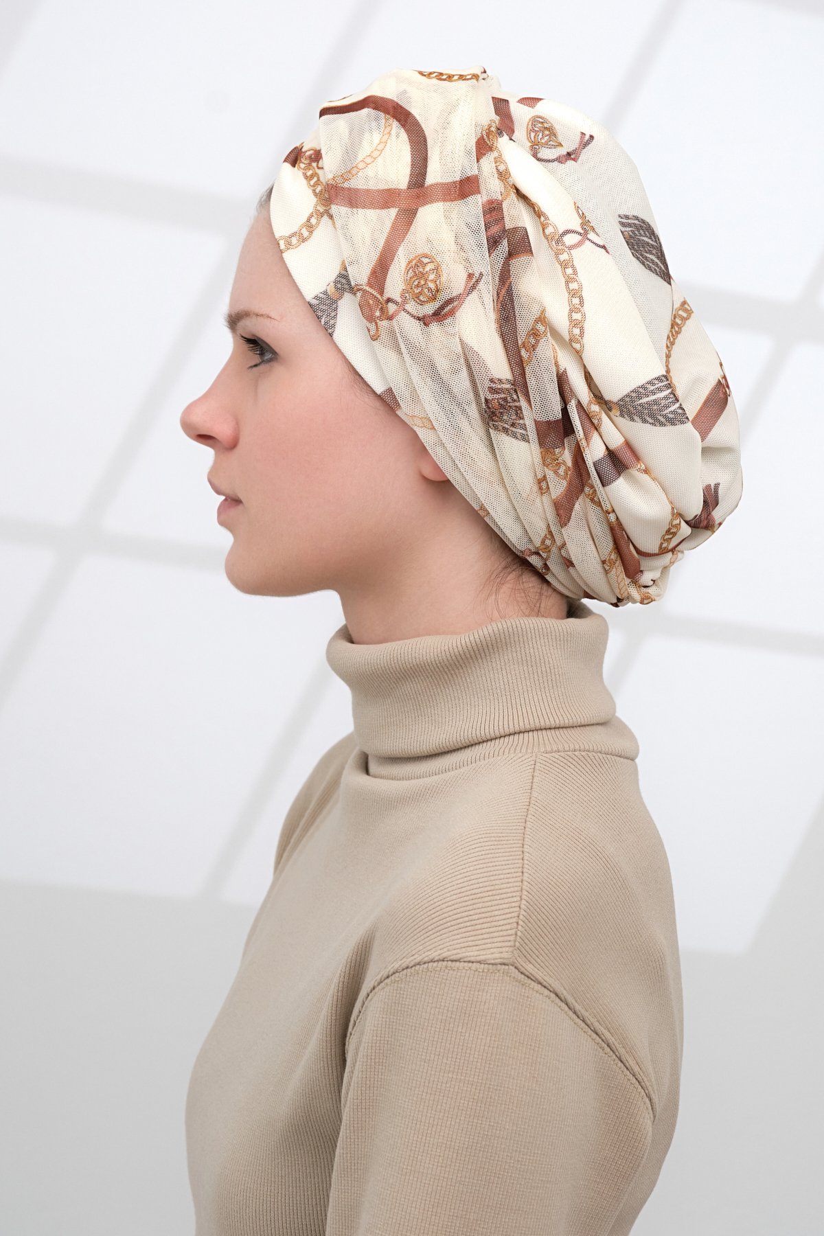 توربان جاهز مصنوع من خامة تُل بليسيه خفيفة ومريحة، مثالي لأيام الصيف الحارة بفضل خفته ونعومته على الرأس.