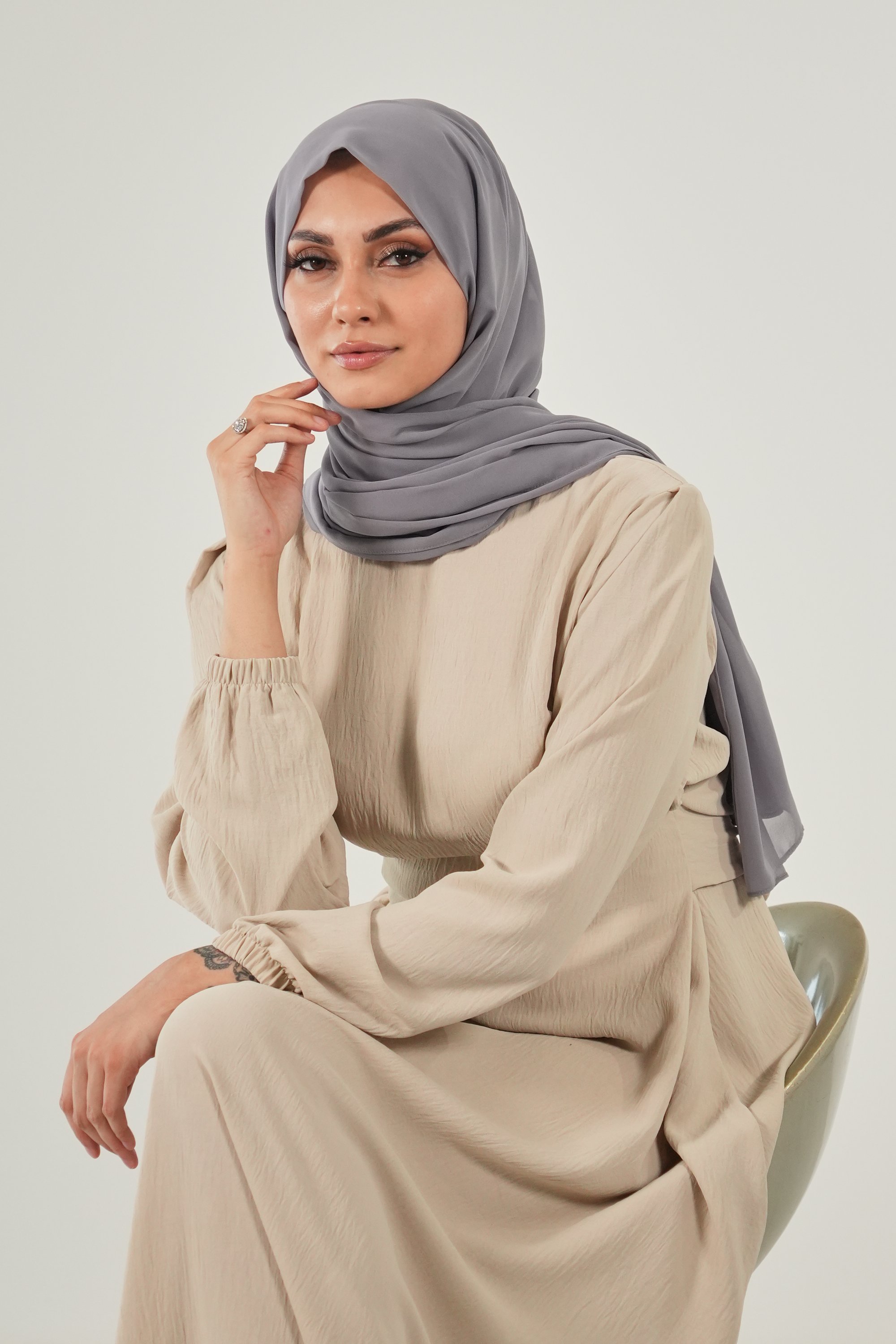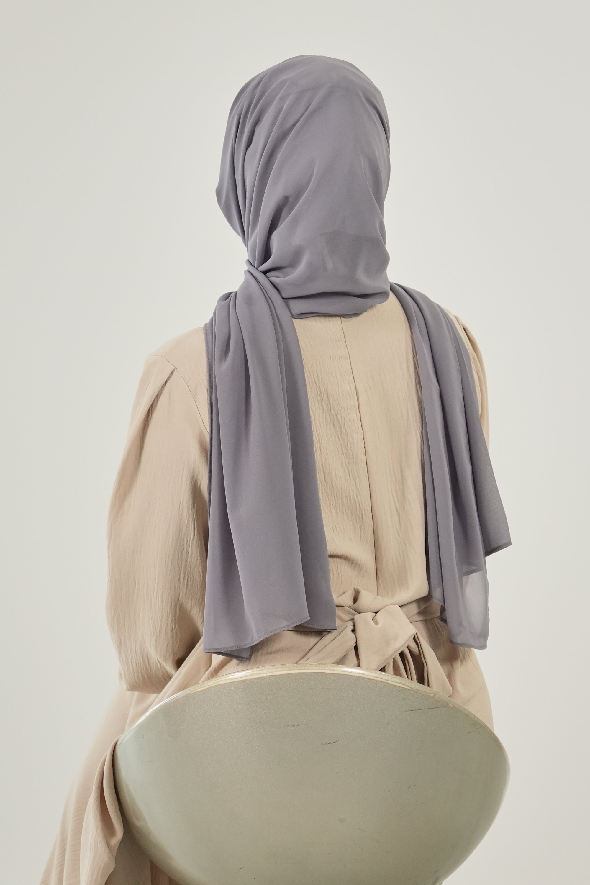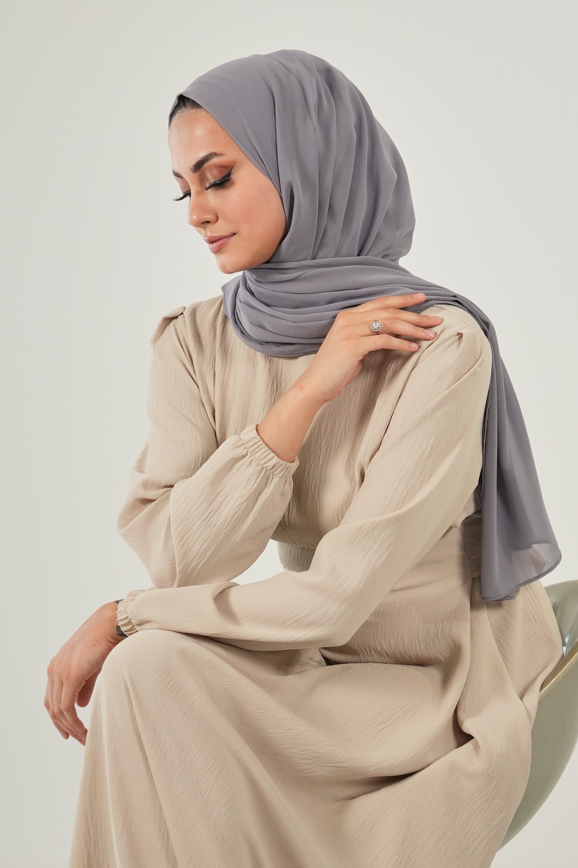 طرحة الشبفون واسعة وطويلة، بملمس متوسط الخشونة ليحافظ على شكلها الأنيق عند التصفيف، ويمكنك تنسيقها بسهولة على الكتفين بأسلوب انسيابي أنثوي.